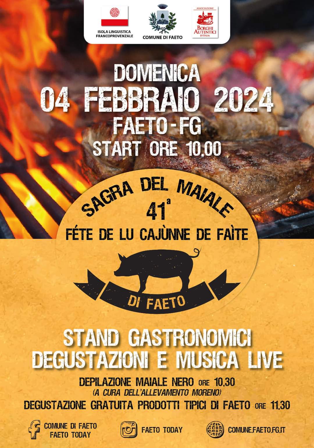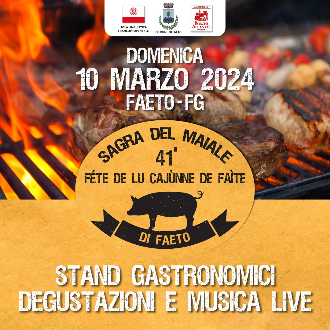 The festival is dedicated to the black pig of the Monti Dauni, indigenous breed, bred in the wild and characterized by small size and lean meat and tasty. The festival is based on the peasant custom of killing pigs between the end of January and the beginning of February to process the meat: some of them prepared for preservation and long-lasting use, using capocolli, bacon, sausages and hams to be dried; other non-perishable, consumed on the spot.