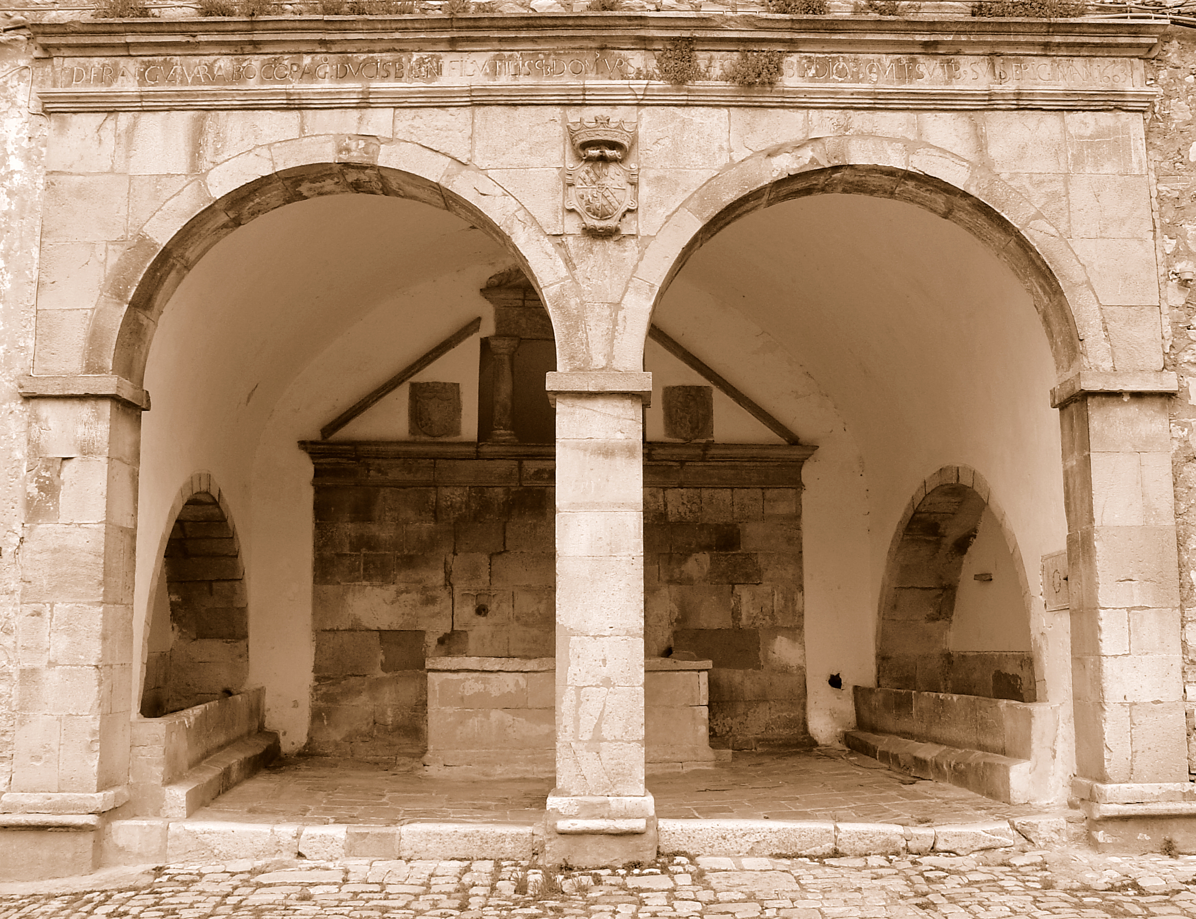 It is an elegant fountain built in 1457 and enlarged by the Guevara dukes in 1663. The architecture consists of a room which is accessed by two large arches. In this portico on the bottom are the pipes for the water supply and the stone basin for their collection. On the top a sort of tympanum is broken by two small Doric columns that support a entablature; on the right side the coat of arms of Orsara depicting a rising bear, on the left the coat of arms of the Guevara. On the two sides of the porch there are two sinks equipped with kneeling. The beauty of the purely Renaissance forms of the plant is added to the anthropological and social importance of this artifact, which for centuries has been one of the places most frequented by the female population of the village.
