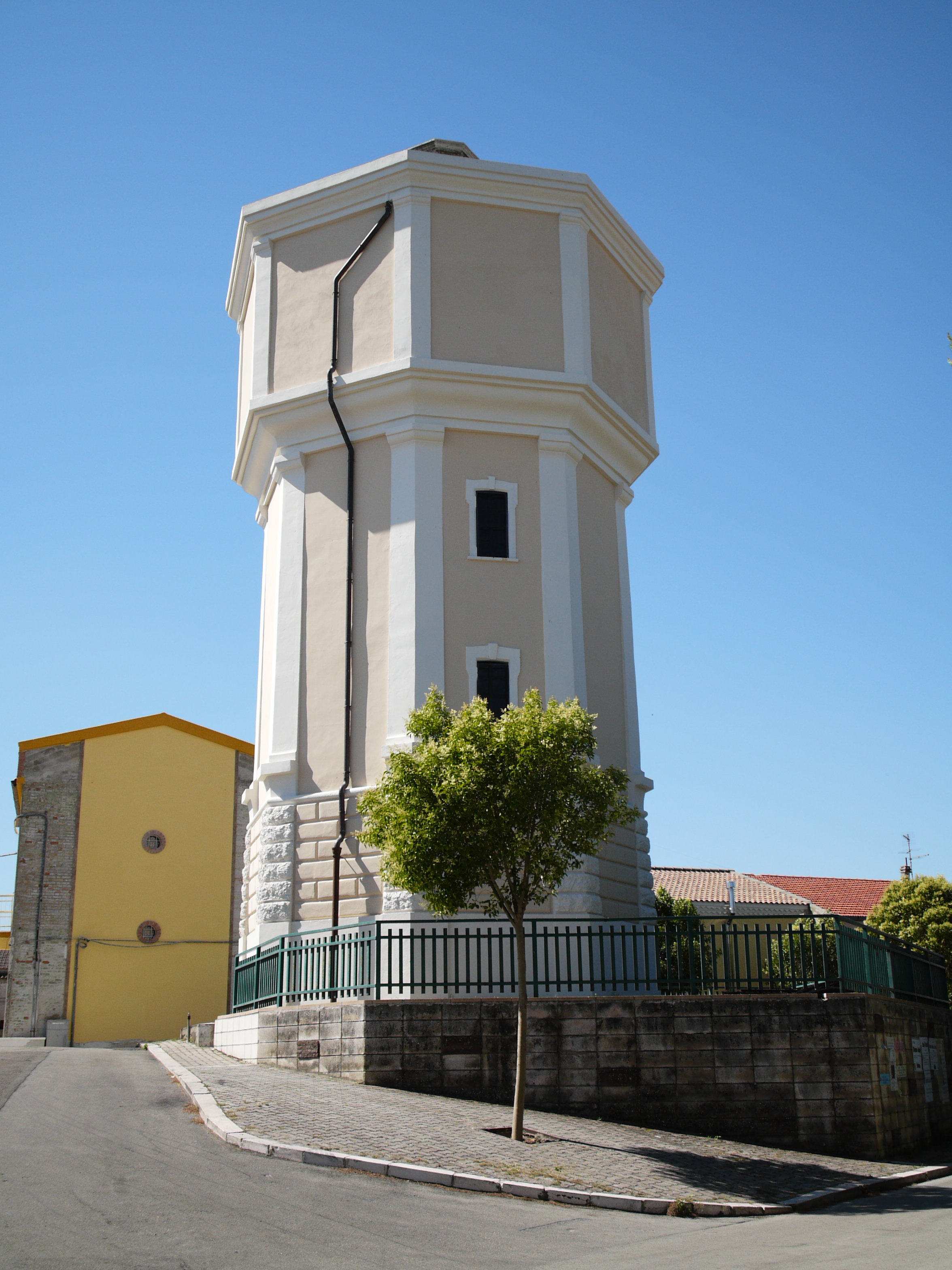 The piezometric tower is located in the city center and serves as a water reserve with the aim of obtaining a pressure in the main pipes. Unlike most of these structures, it has a full turriform body and not a metal lattice, which endows it with a particular charm. Particular attention is paid to its architectural composition. The tower has a two-band plinth, the lower smooth and the second rusticated, interrupted only by the door of access to the artifact, at which there are the only two windows of the building, marking the levels externally. On the plinth and at the edges of the octagon, the angular pilasters of a white colour start throughout the height of the tower, while the walls of the tower are plastered with a pale yellow.