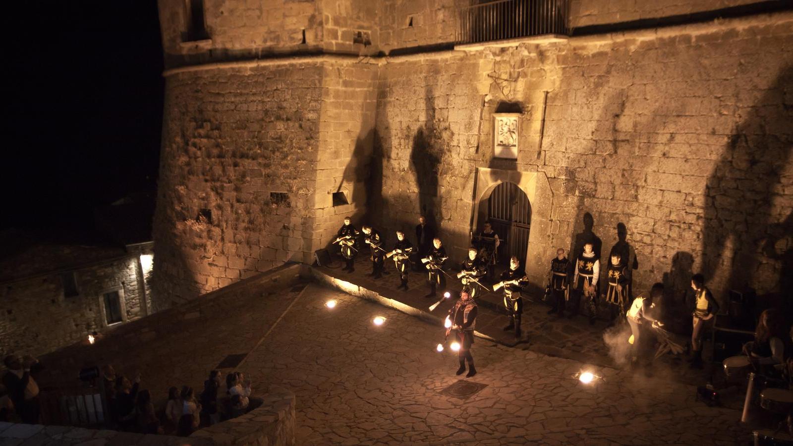 Tra i ritmi degli sbandieratori e le suggestive lingue di fuoco degli artisti di strada si inizia alle ore 17 in piazza Aldo Moro con il Palio della Rocca. Combattimenti di spade, giochi popolari fanno da cornice alla corsa degli asini per assegnare il palio ad una delle quattro contrade (Cittadella, Lampione, Piazza e Capannoni). In serata (dalle 21.30) nel centro storico saranno servite 6 pietanze a base di prodotti tipici locali, preparate secondo antiche ricette medievali. Ad allietare la cena uno spettacolo di musica rinascimentale. L’incendio al castello chiude questo il viaggio nel tempo. Alla magia dei fuochi viene contrapposta la determinazione dei cavalieri che assediano il castello, con tentativi di difesa e l’attacco delle truppe nemiche, trasformando il tutto in un vero e proprio film da vivere in diretta.