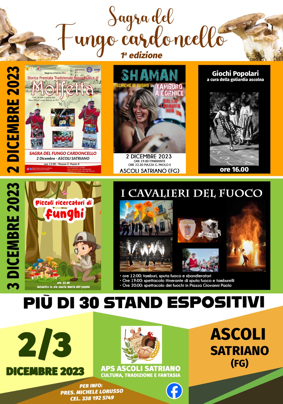 Con più di 30 stand espositivi, la prima edizione della sagra del fungo cardoncello vi aspetta il 2 e il 3 dicembre ad Ascoli Satriano.
