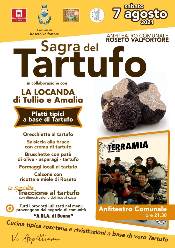 Nella splendida location dell’Anfiteatro comunale, sabato 7 agosto a partire dalle 21:00, a cura de La Locanda Di Tullio e Amalia, potrete degustare piatti dedicati al pregiato tubero, dalle orecchiette al tartufo alla salsiccia con crema di tartufo, e poi ancora bruschette con patè di olive-asparagi-tartufo, formaggi locali al tartufo, calzone con ricotta e miele di Roseto, in più sarà possibile assistere alla dimostrazione dei mastri casari nella realizzazione del treccione al tartufo.