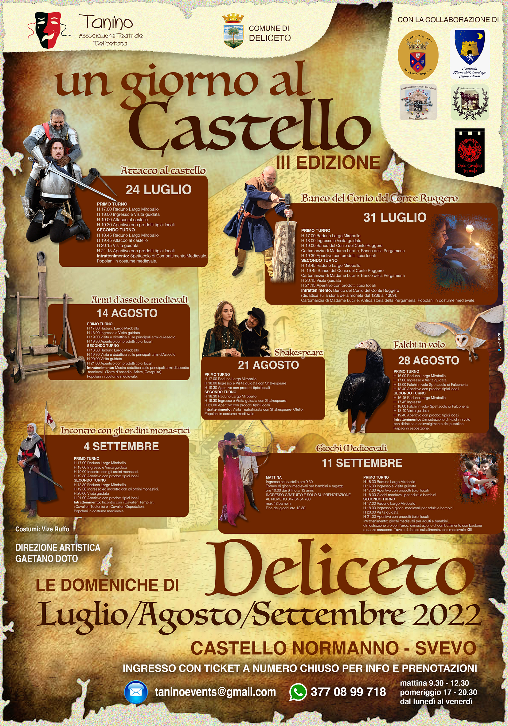 Un giorno al castello è un evento medievale organizzato dall’Associazione Teatrale Tanino di Deliceto con il Patrocinio del Comune di Deliceto che quest’anno giunge alla terza edizione dopo due anni di forte partecipazione e di feedback positivi da parte dei visitatori che in tanti hanno varcato il portone principale di uno dei castelli meglio conservati della daunia che conserva da più di mille anni la sua struttura difensiva.