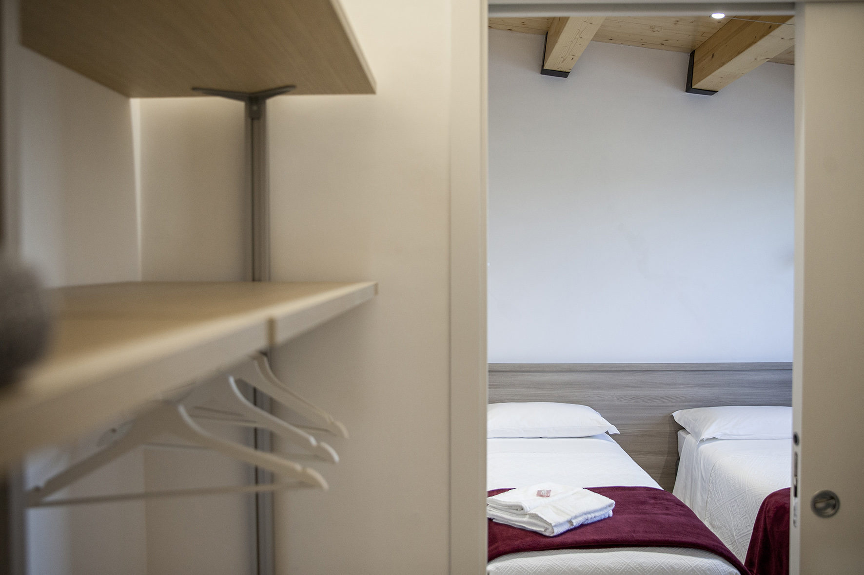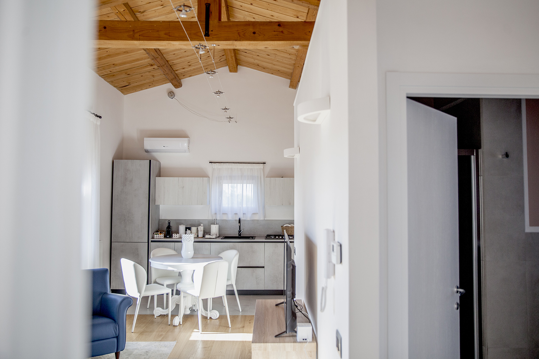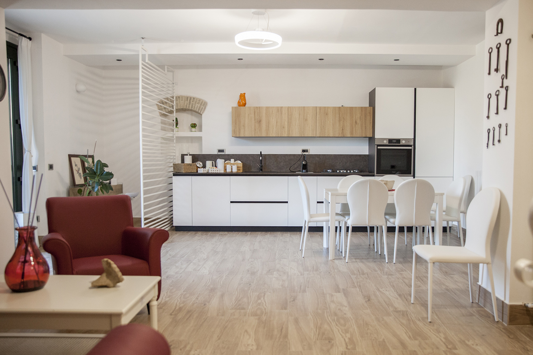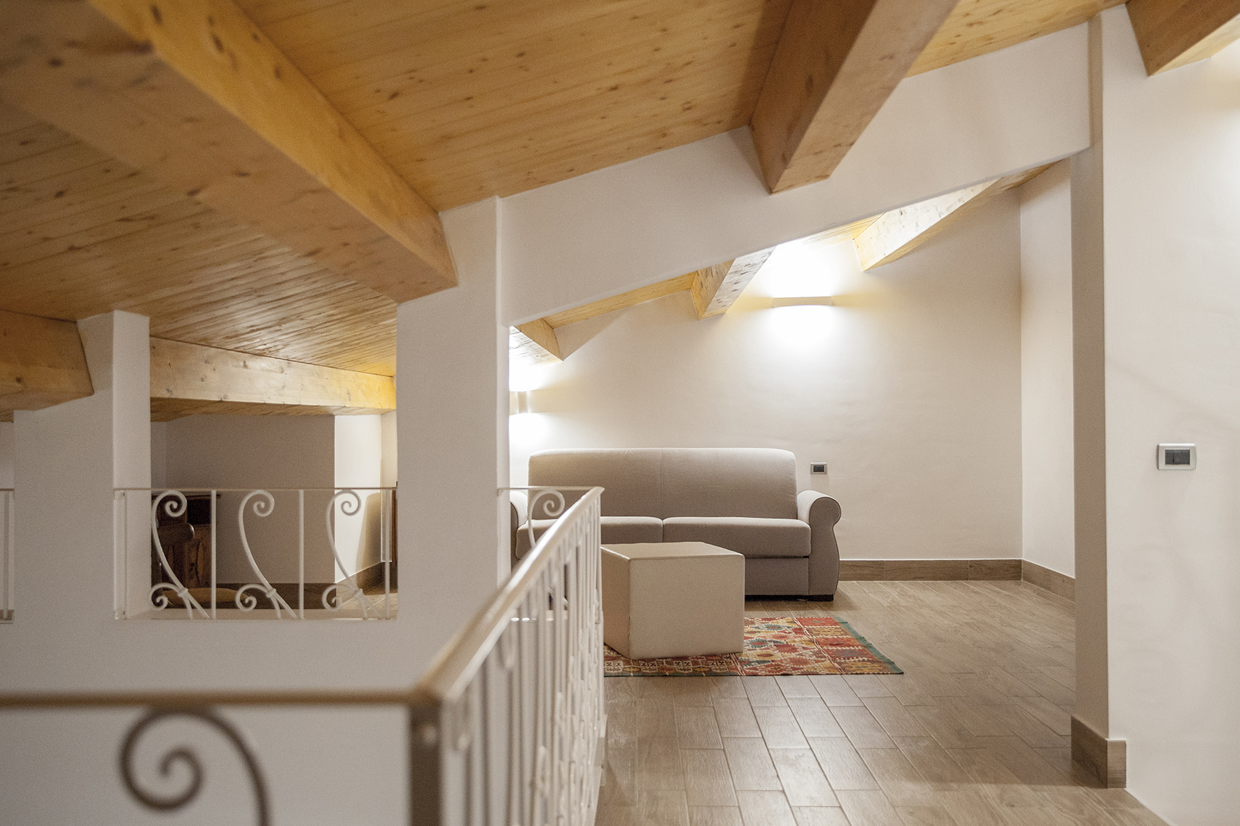 2° blocco: una camera matrimoniale e una camera doppia con i rispettivi bagni, un ampio soggiorno (con cucina e divano letto), e una camera open space con divano letto e possibilità di aggiunta di altri 2 posti letto con bagno esclusivo ideale anche per comitive fino a 8 persone.