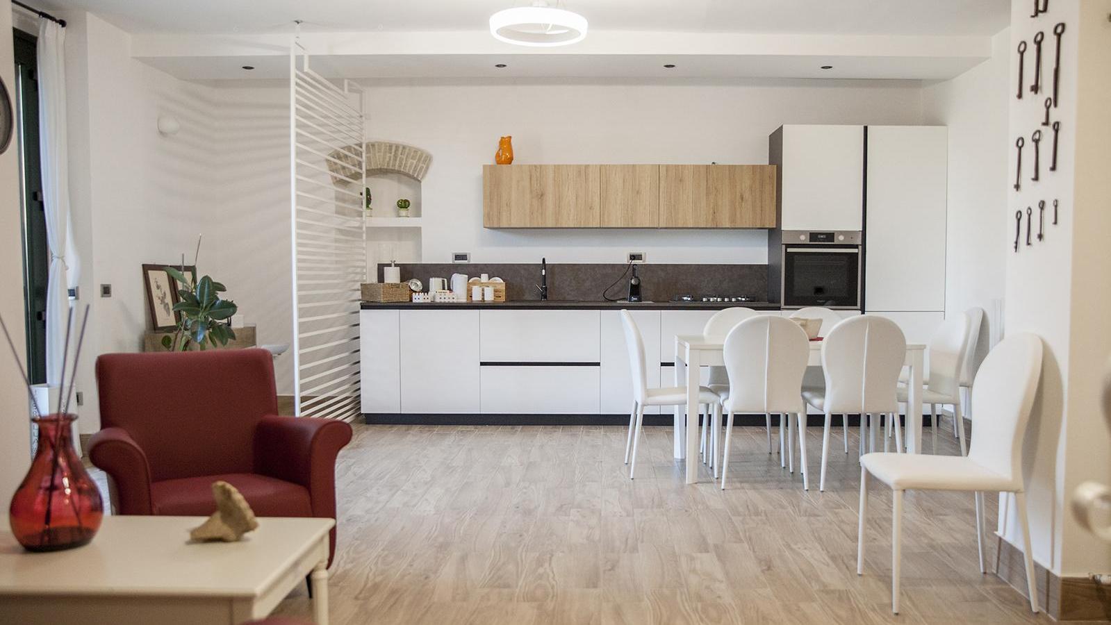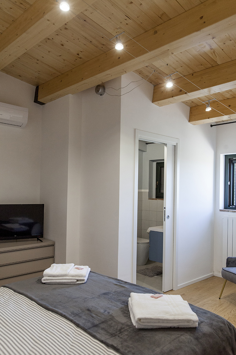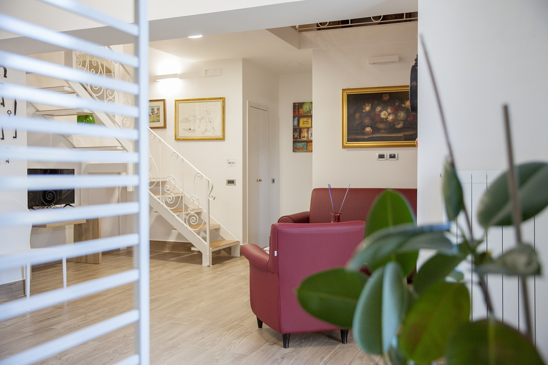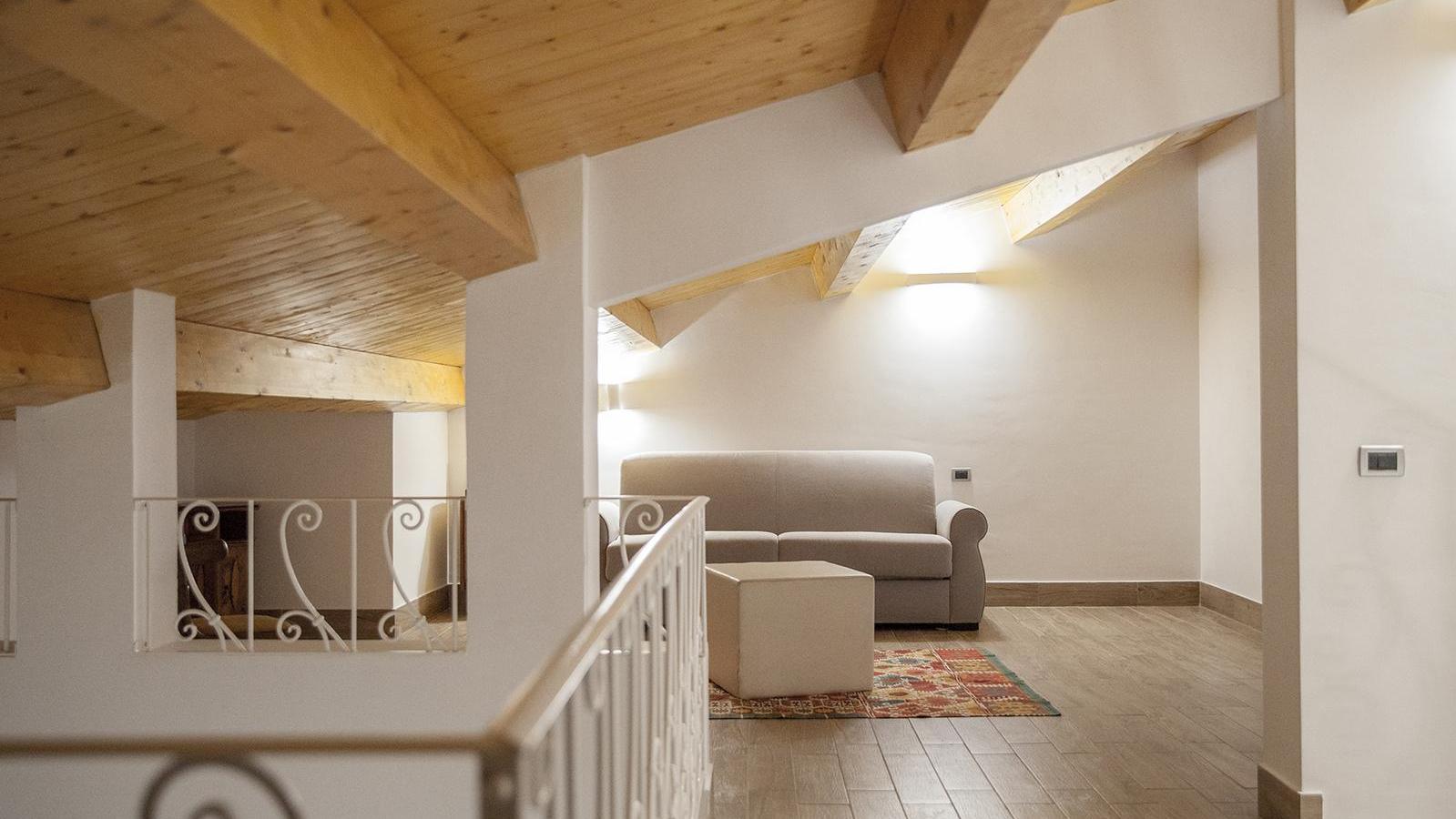 2° blocco: una camera matrimoniale e una camera doppia con i rispettivi bagni, un ampio soggiorno (con cucina e divano letto), e una camera open space con divano letto e possibilità di aggiunta di altri 2 posti letto con bagno esclusivo ideale anche per comitive fino a 8 persone.