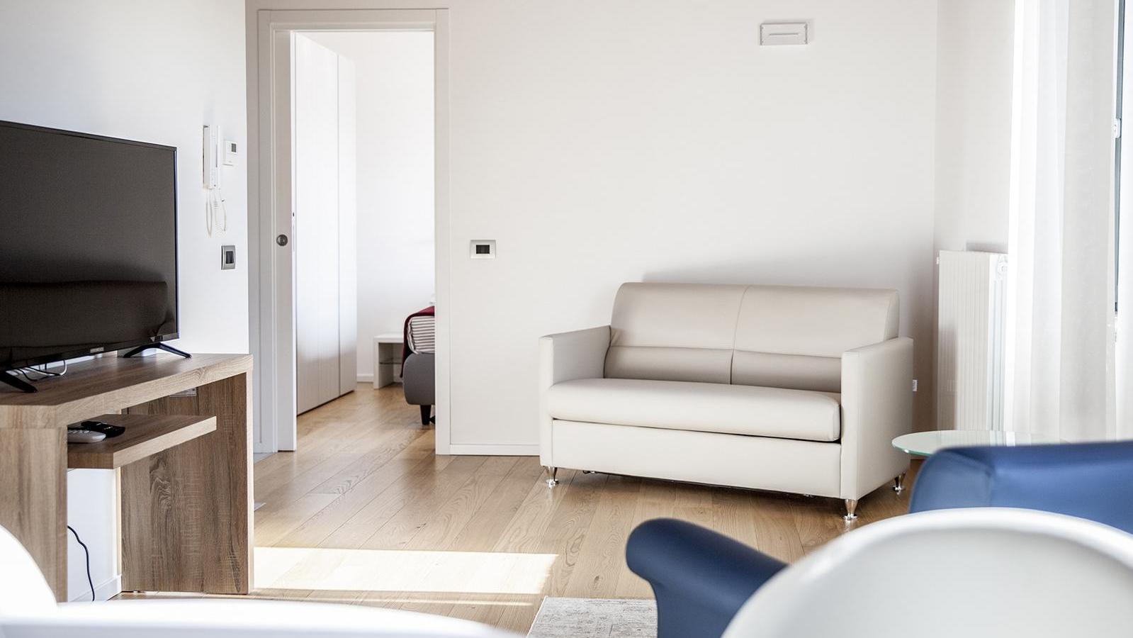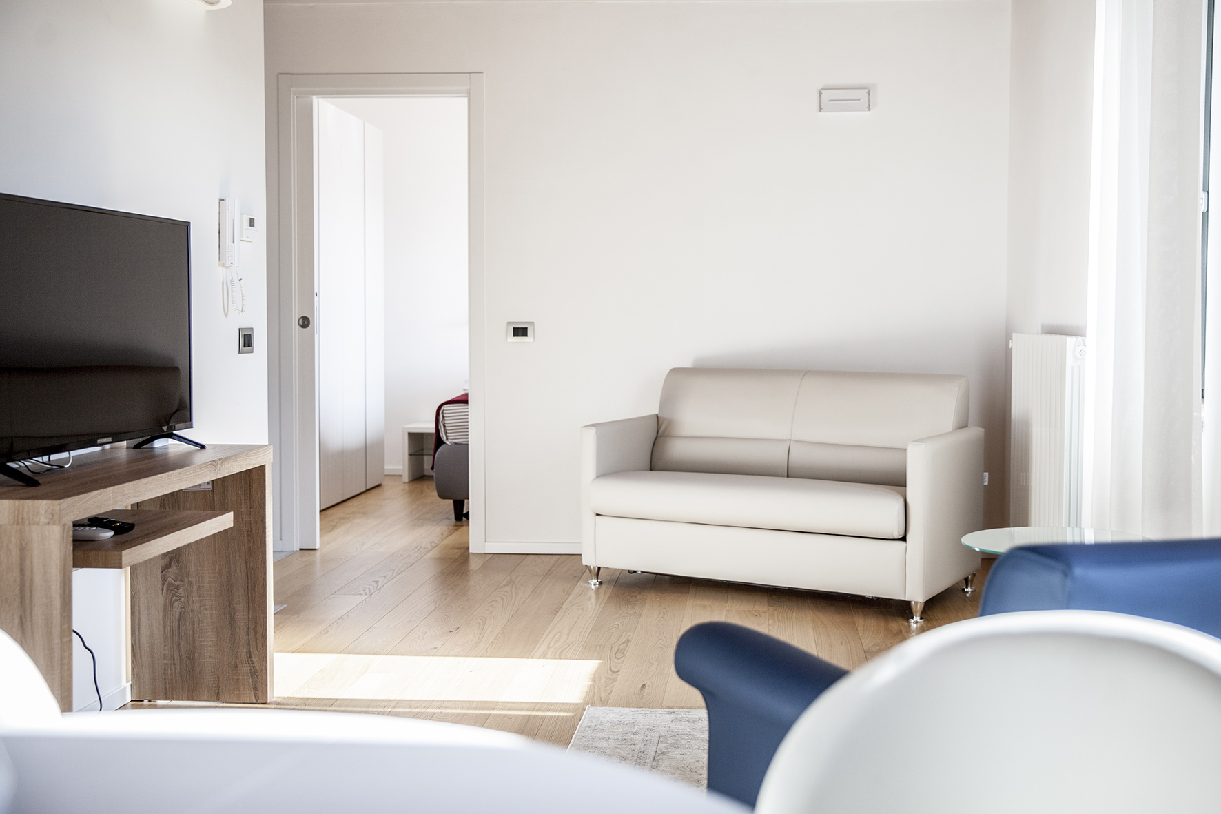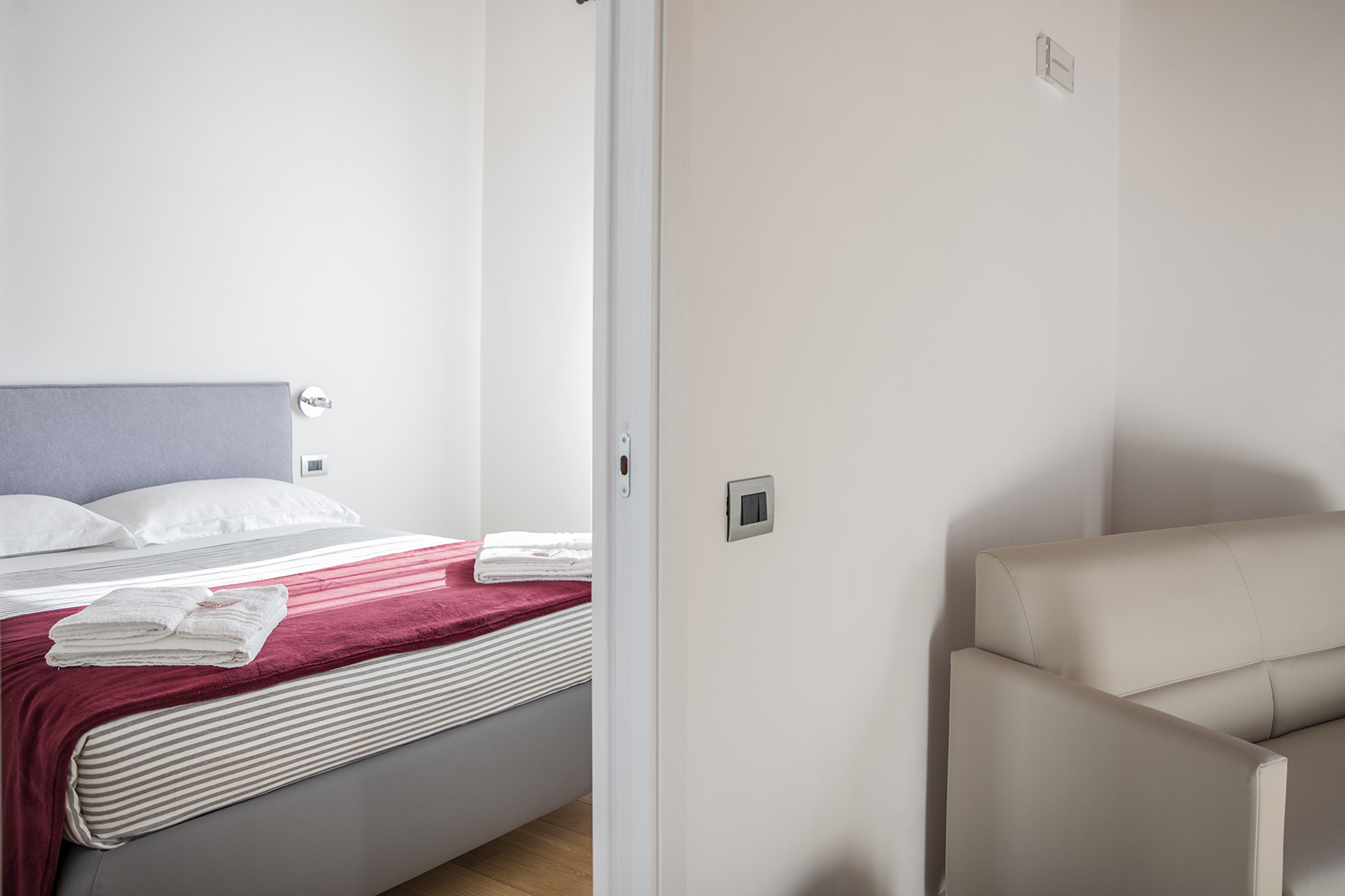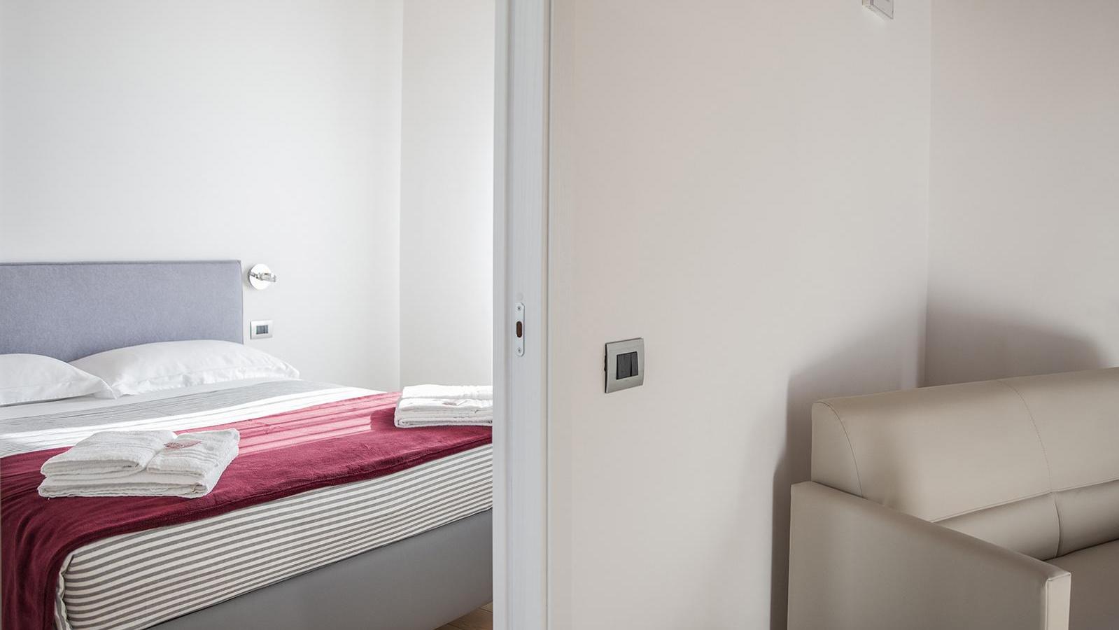 3° blocco: mini appartamento al 1° Piano con una camera matrimoniale, bagno e soggiorno (con cucina e divano letto) ideale per 2-3 persone.