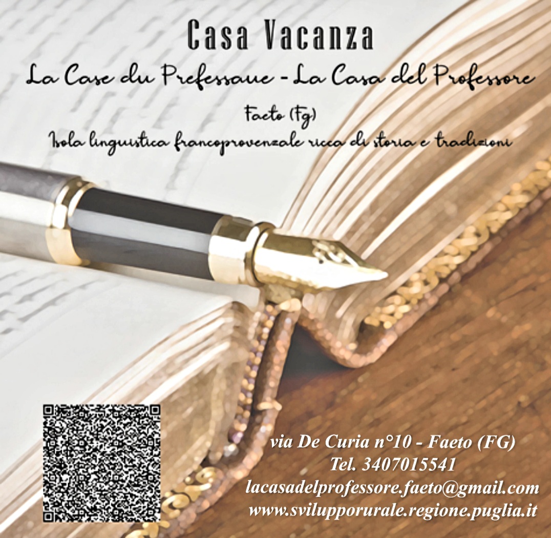 Faeto - Casa Vacanza "La Casa del Professore": luogo ideale dove ritrovare la propria tranquillità e relax. La struttura dista 45 km da Foggia e 23 da Lucera. La Casa dispone di appartamenti confortevoli, completamente arredati e completi di tutti i servizi. Tutti gli spazi de "La casa del professore" sono dotati di connettività WI-FI free, senza limiti. La Casa è situata in un punto strategico del paese, vicino ai servizi essenziali, al municipio e alla chiesa parrocchiale.