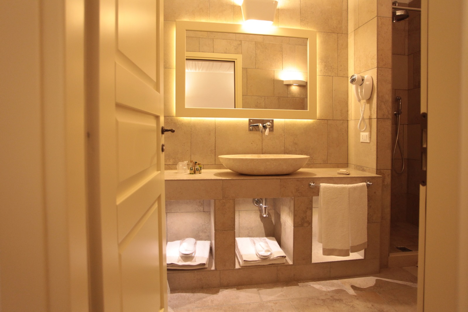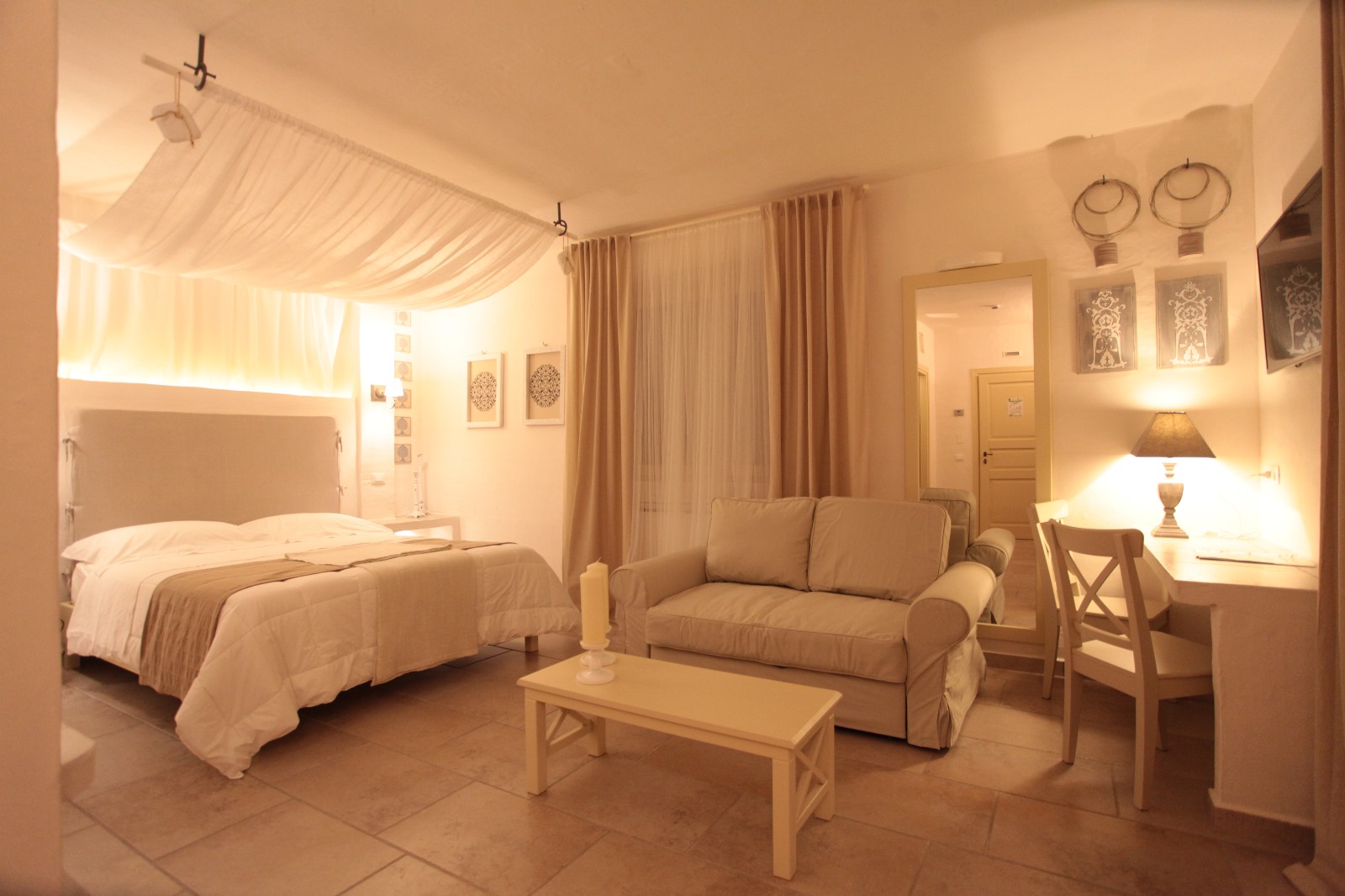 Il bianco domina dappertutto, appena smorzato dai dettagli color avorio e nocciola. Bianco e colori neutri sono la caratteristica di tutti gli ambienti, e delle camere in particolare, del Relais Incontrada, un bell’affittacamere a Lucera, anche se chiamarlo così è piuttosto riduttivo. Gli spazi infatti sono generosi e pieni di luce, i bagni ampi, l’arredo è curato ed essenziale senza per questo risultare scarno. Il gusto strizza l’occhio allo shabby-chic, gli somiglia anche se si sottrae all’obbligo del “fintamente vecchio”, del “volutamente rovinato e recuperato”.