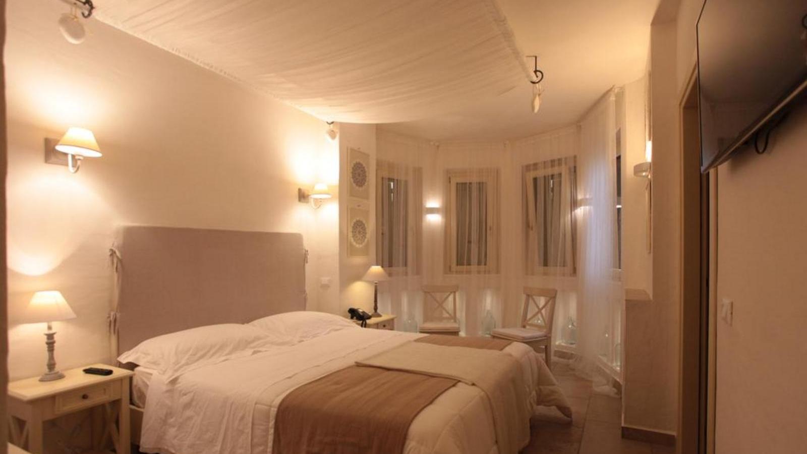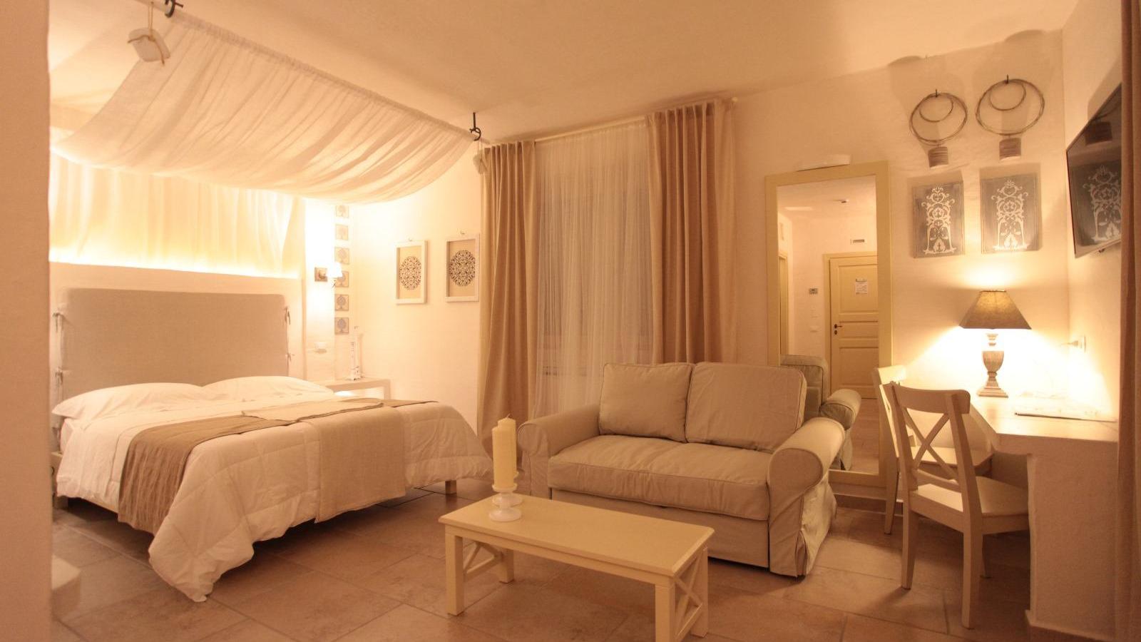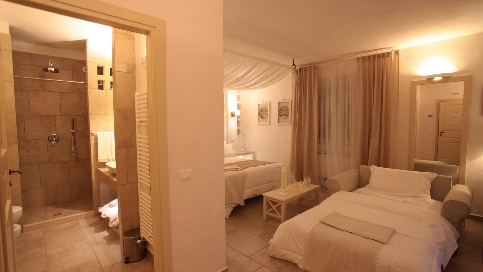 Questo affittacamere appena fuori Lucera ha camere standard dai nomi evocativi: la Finamunno fa pensare a qualcosa che sta alla “fine del mondo”; la Percettore invece azzera le distanze e ci ricorda che la contrada in cui ci troviamo si chiama così. Sono le camere cosiddette del Massaro, anche se nessun massaro ne ebbe mai sicuramente una tanto bella con vista a perdita d’occhio sui colori del Tavoliere, climatizzatore, specchi, smart tv, wifi, telefono, cassetta di sicurezza, minibar, doccia e lavabo in pietra. La Torrebianca invece è la camera signorile, quella che nelle masserie di una volta sarebbe stata riservata agli ospiti di riguardo: il letto è riparato dal baldacchino di tela arricciata; le quattro finestre si aprono su un mezzo ottagono; le nicchie ricavate nello spessore dei muri sono illuminate; il bagno sarebbe meglio chiamarlo stanza da bagno, viste le dimensioni. E infine c’è la camera padronale, la Quadrofico, che si apre su un’ampia veranda ed ha un angolo-salotto con scrittoio che sarebbe piaciuto ai viaggiatori dell’Ottocento.