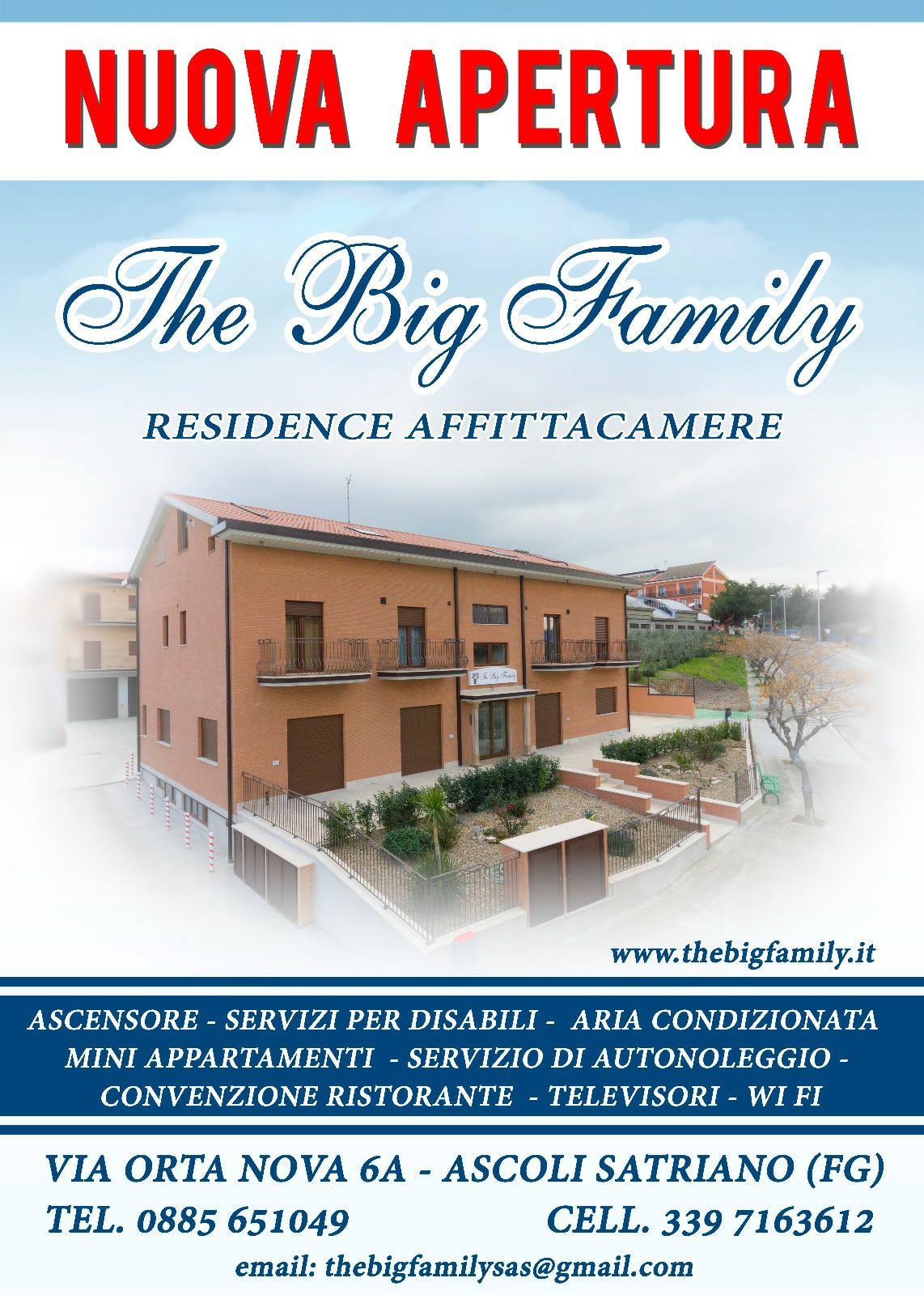The Big Family è un residence di recente costruzione a gestione familiare, situato ad Ascoli Satriano, a soli 30 km da Foggia. Dispone di 4 camere matrimoniali dotate di ogni confort: bagno privato, climatizzazione, tv, e di 4 Appartamenti in cui troverete anche elettrodomestici e stoviglie.