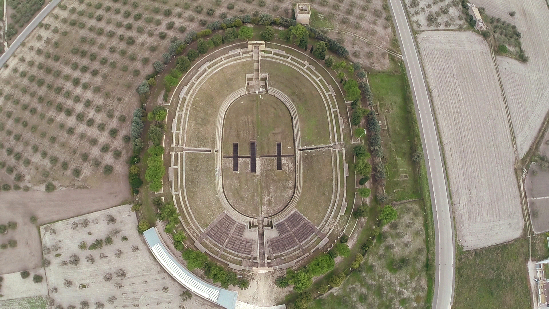 L’anfiteatro si distingue per le notevoli dimensioni (126 x 94 mt ca con un’arena di 75,2x43,2 mt), che testimoniano l’importanza della città.