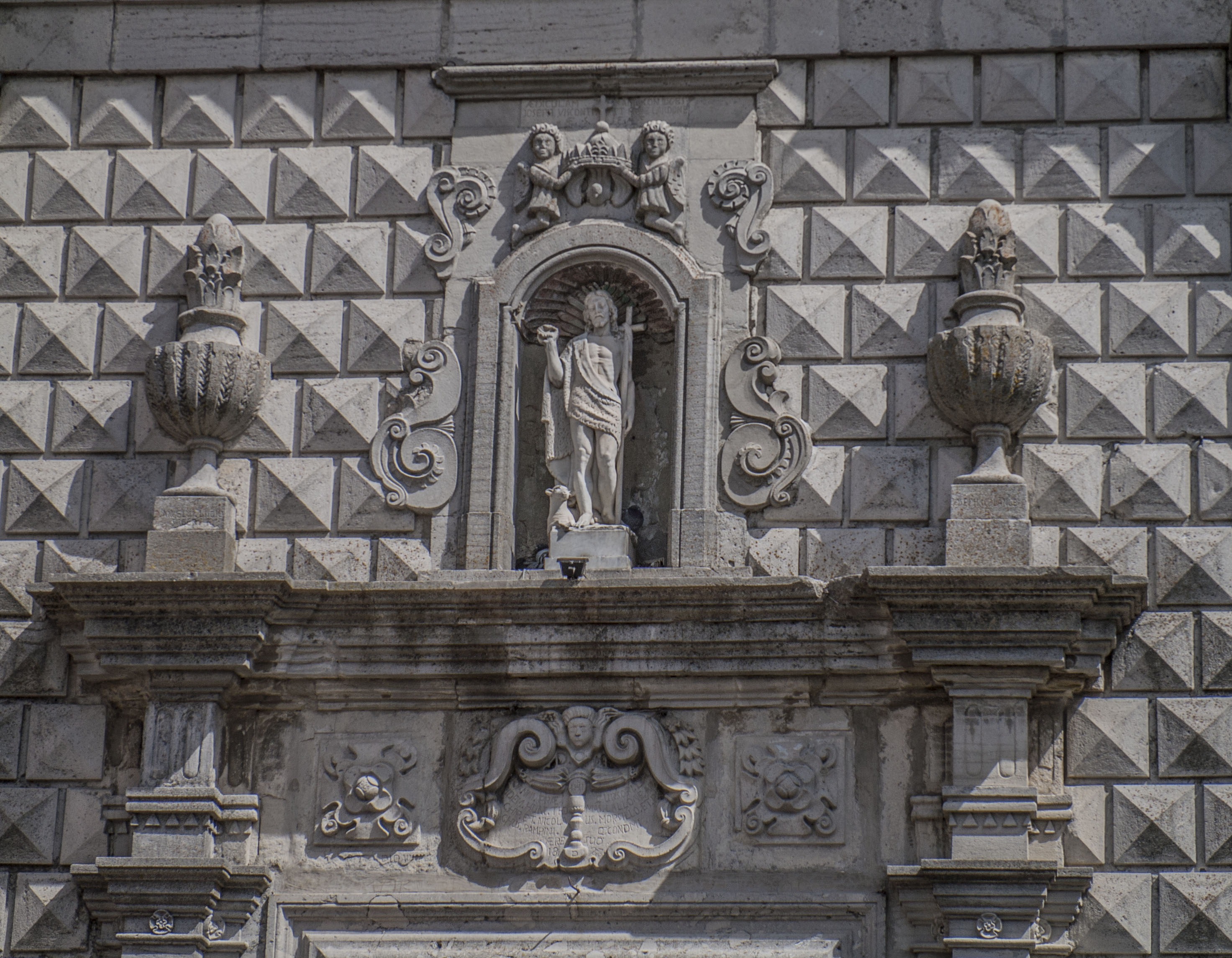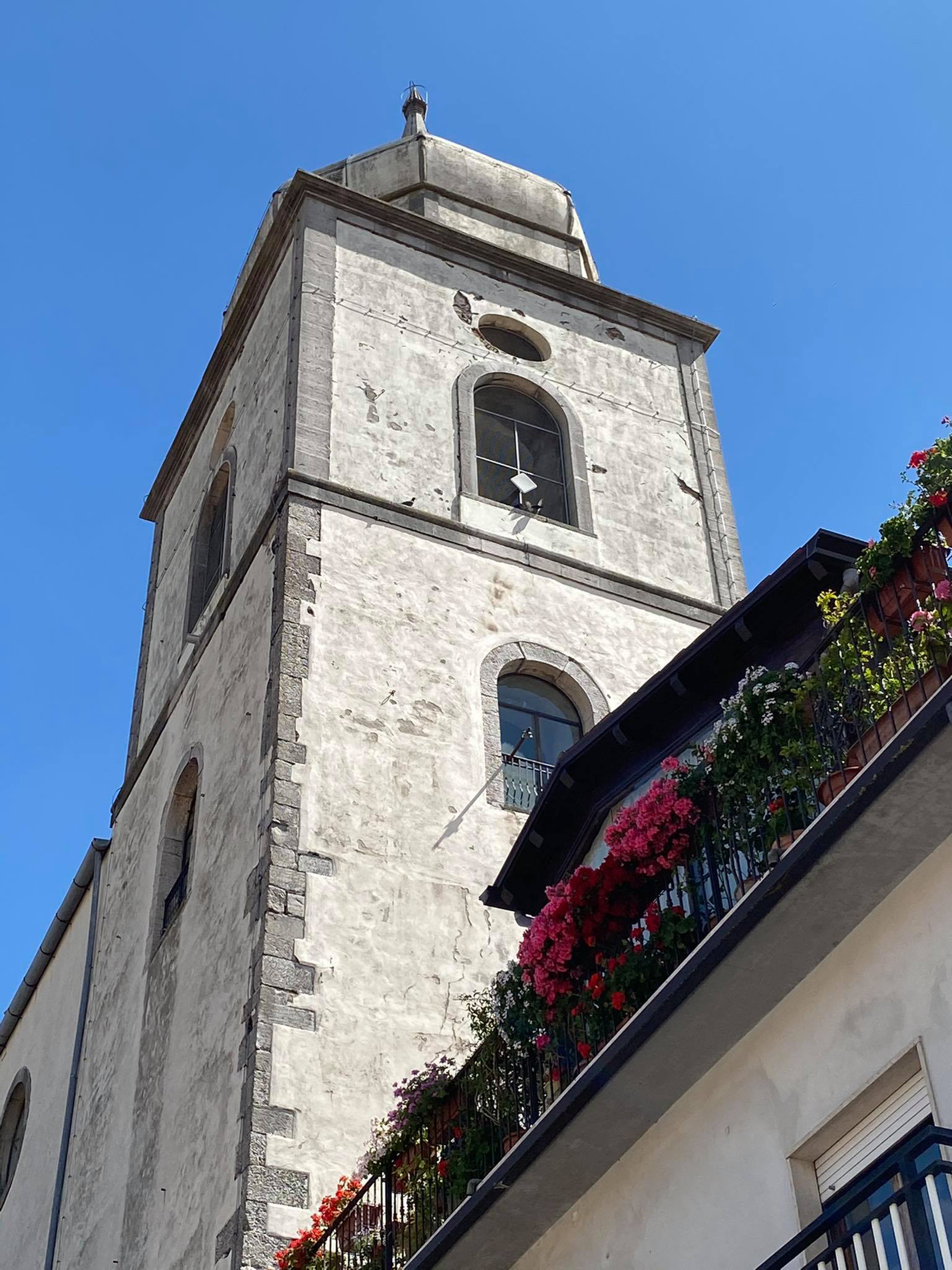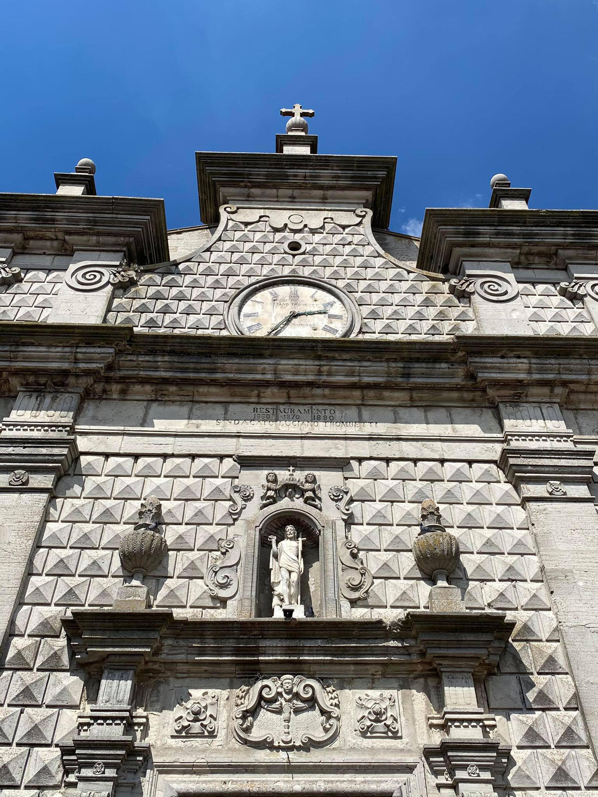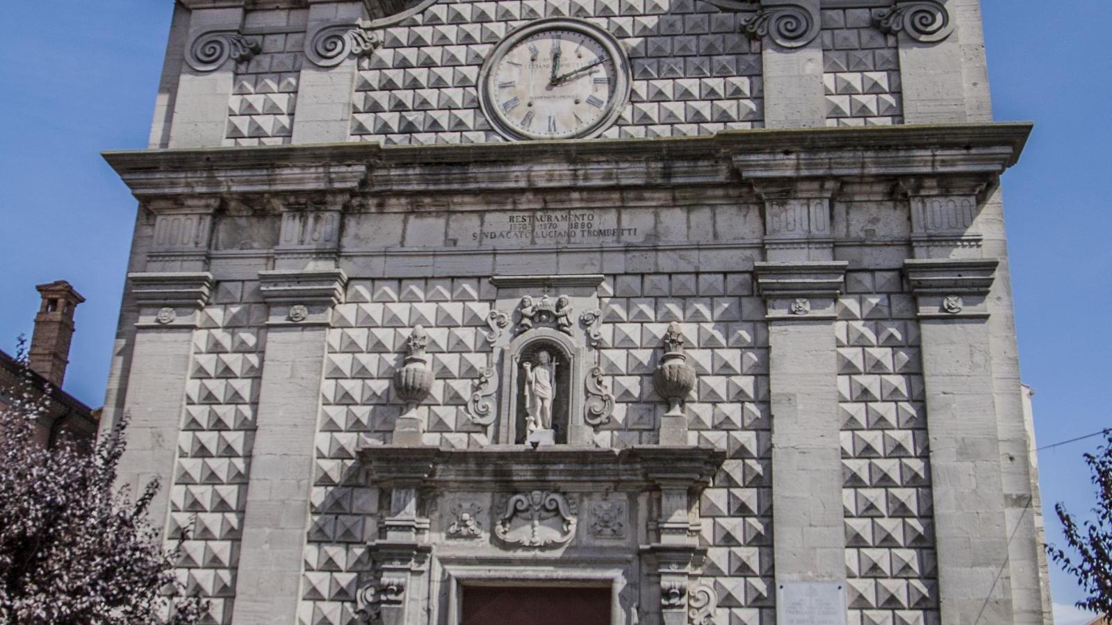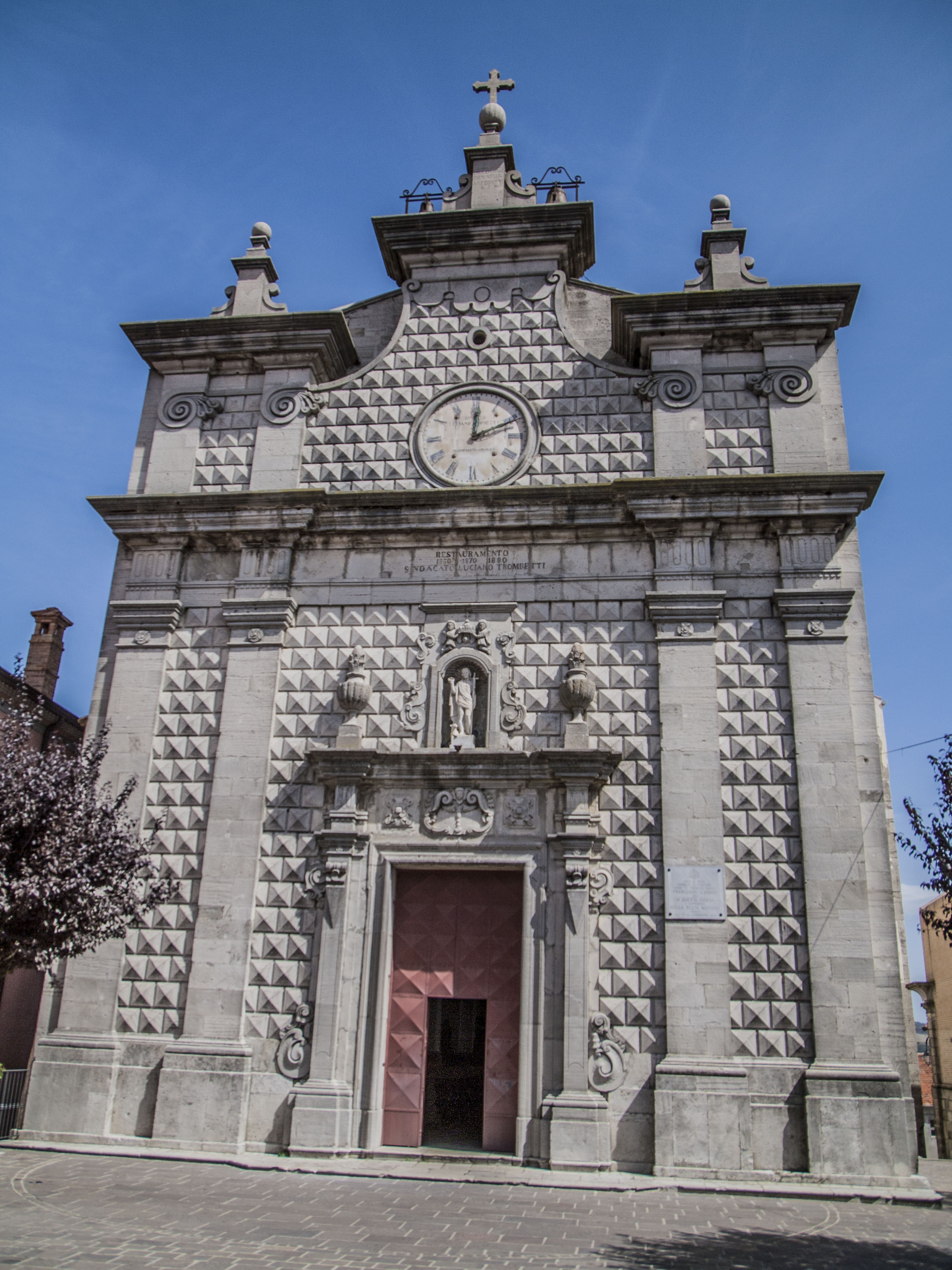 L'elemento di maggior pregio della chiesa è costituito dalla facciata: realizzata in pietra grigia bugnata a punta di diamante è ornata di lesene ed è distinta in due livelli. Il primo livello è caratterizzato dalla presenza di un bellissimo portale lapideo abbellito da fregi floreali e pinnacoli, sul quale insiste una nicchia che ospita la minuta statua del santo. Il secondo livello presenta maggiori elementi curvilinei e un orologio in posizione centrale. Molto bello è anche il possente campanile del 1832 terminante con una cupola a bulbo.