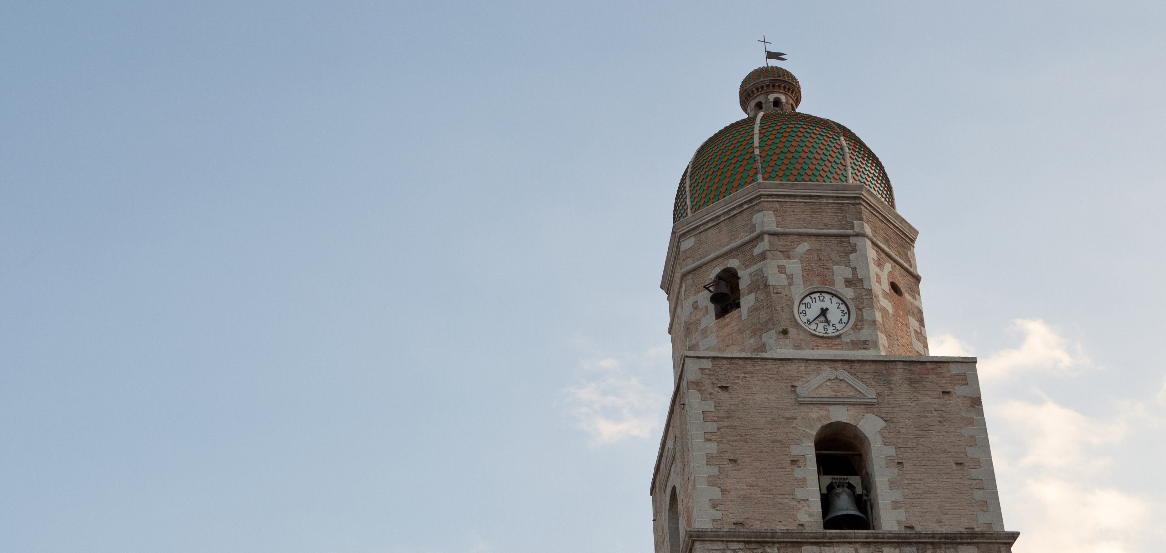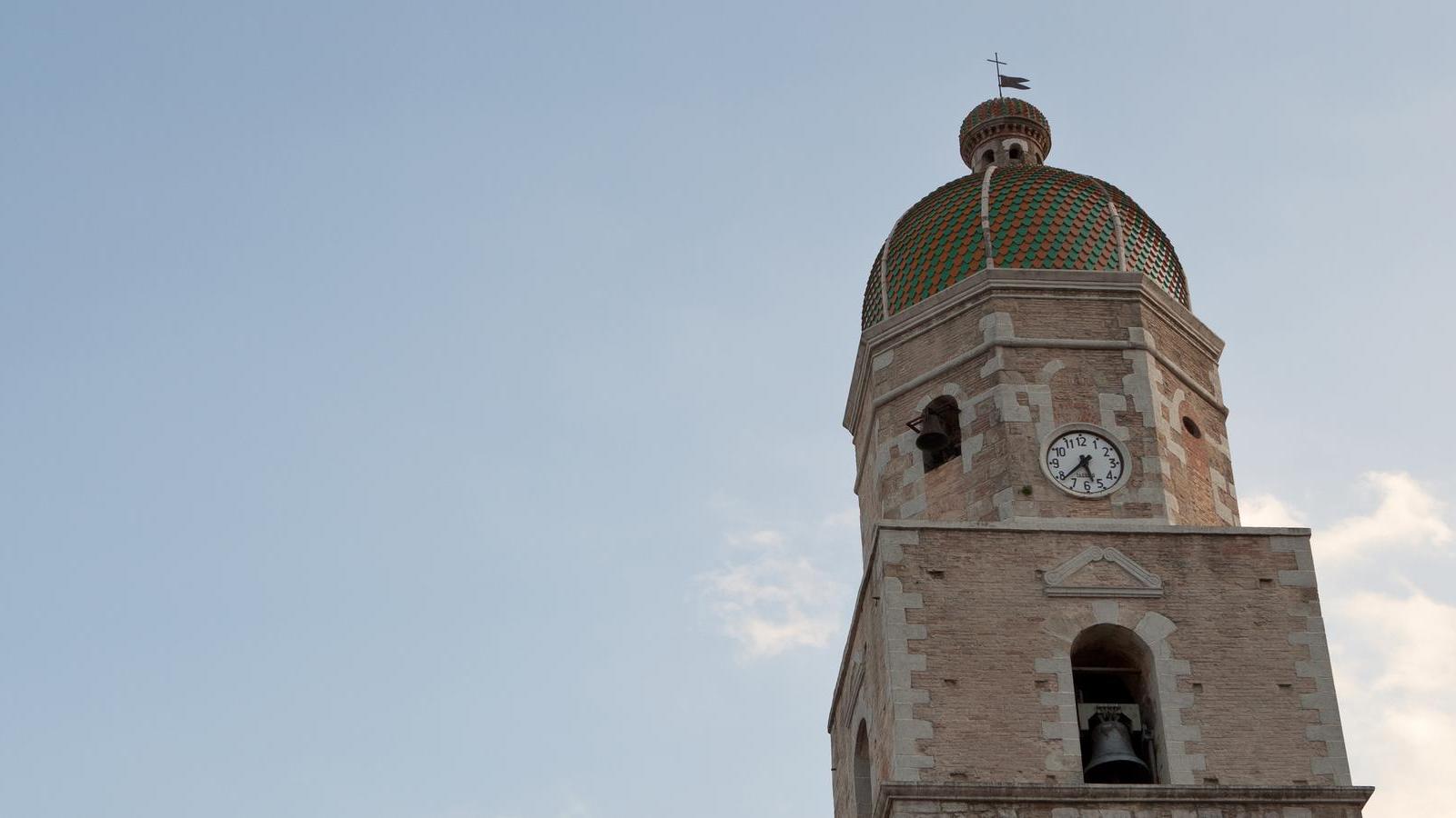 Sul lato esterno destro e alle spalle della chiesa sorge un ampio piazzale lastricato; un tempo qui sorgeva un bel giardino pensile. Ammirando la Chiesa esternamente si rimane affascinati dalla torre campanaria che sfoggia, dalla sua altezza di 30 metri, una meravigliosa cupola rivestita in maioliche gialle e verdi.