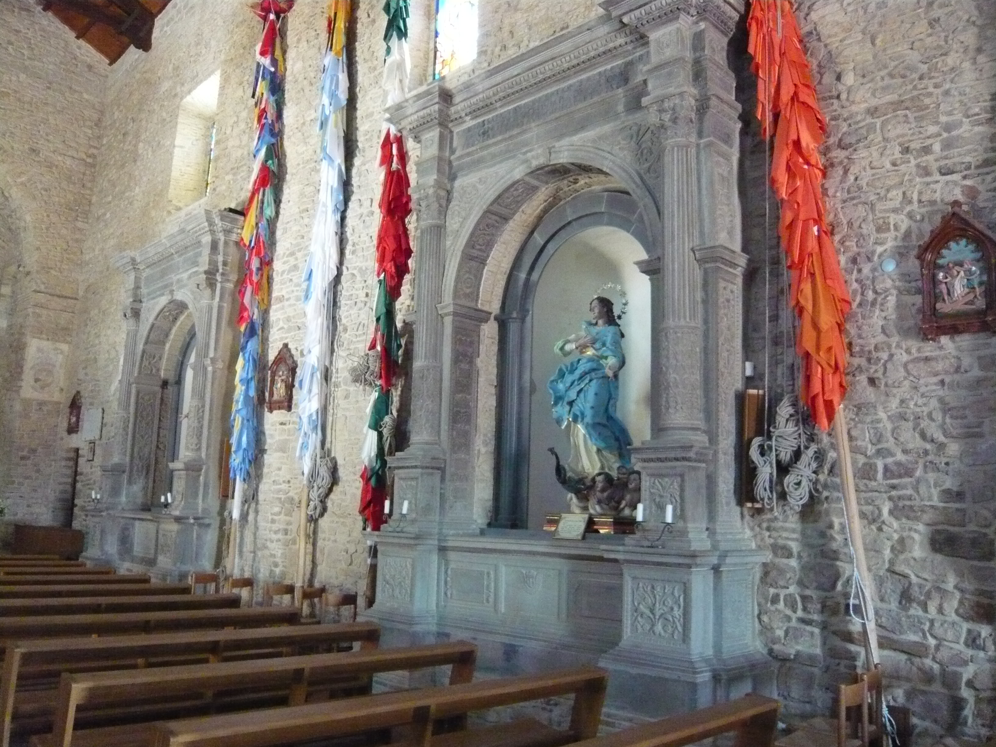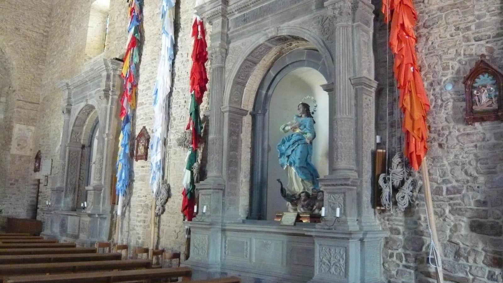L’interno colpisce la rigorosa bellezza dell’ampio spazio a navata unica che si eleva per un altezza di circa 15 metri, terminando in una serie di capriate lignee. Lo stile complessivo è di impronta romanica, ma si sottolinea lo stampo gotico nell’area dell’antico presbiterio e le arcate rinascimentali delle cappelle laterali e delle due arche cinquecentesche in pietra grigia delle nicchie laterali fatte costruire dalla famiglia Tinto nel 1567 e di probabile fattura rosetana. Piccoli tocchi barocchi sono l’altare maggiore, al di sotto del quale si trova una cisterna, e le finestre lungo la parete destra. Oltre alla Statua della Vergine l'edificio sacro custodisce un bel fonte battesimale e la statua di Sant'Alberto il Normanno, vescovo della scomparsa città di Montecorvino; ogni 16 maggio dalla chiesa parte un pellegrinaggio penitenziale molto sentito e scenografico, per la presenza di alti palii addobbati da foulard colorati, che riporta l'effigie del santo ai ruderi della cattedrale di cui fu vescovo.