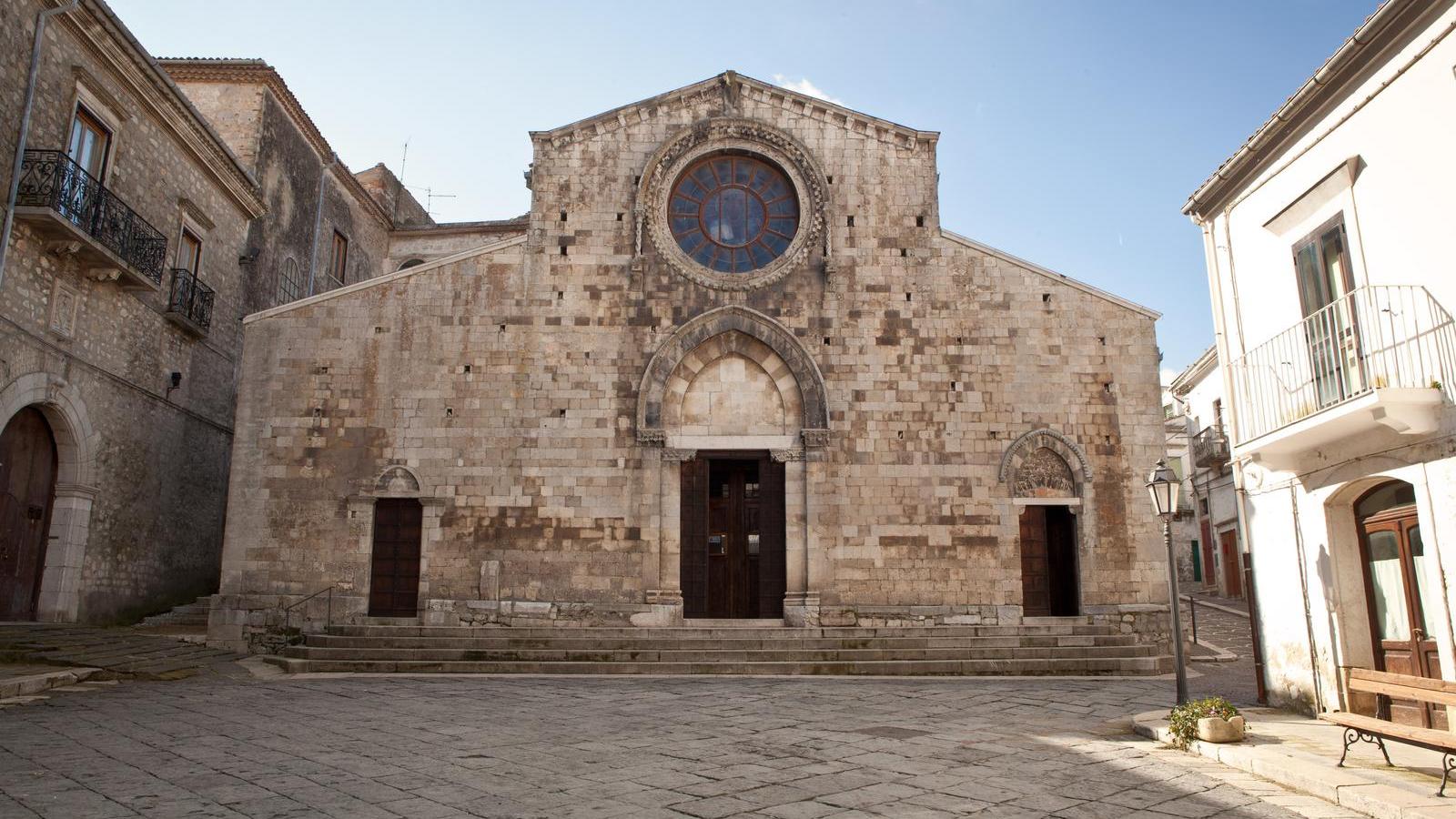 La prima originaria cattedrale di Bovino risaliva all'epoca costantiniana e venne distrutta da Costante II nel 663. L'edificio venne quindi ricostruito e ristrutturato più volte nei secoli. L'aspetto attuale è quello che le impose il gallico architetto Zano nel Duecento, utilizzando residui di templi pagani e di privati e pubblici edifici, armonizzandoli col materiale dell'antica cattedrale. La facciata, in conci di pietra squadrati, è un magnifico esempio dell’avvento dello stile romanico in Puglia, anche se già anticipa stilemi propri del gotico e riutilizza elementi decorativi precedenti nelle lunette dei portali e nei motivi vegetali del rosone, al cui centro in seguito alla ricostruzione del 1960 venne allocata la vetrata policroma del Cristo Pantocratore. Ai lati del rosone due colonnine tortili con leoni stilofori, mentre in corrispondenza della linea di colmo del tetto un toro con le corna spezzate. Il curioso aspetto asimmetrico va attribuito alla ricostruzione avvenuta dopo il terremoto del 1930.
