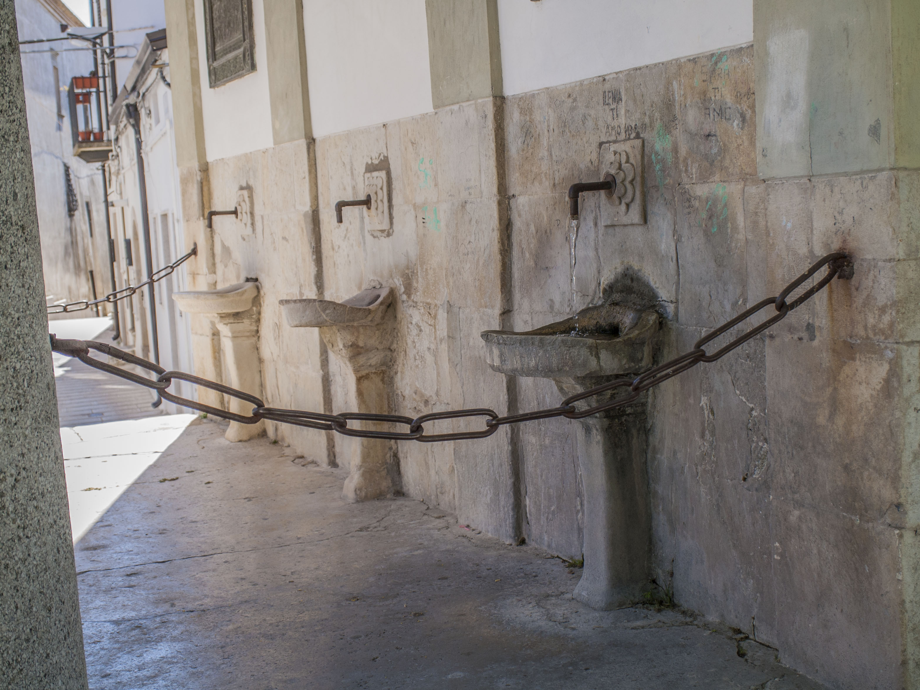 La struttura si caratterizza per il portico realizzato con quattro colonne in pietra locale, ciascuna dal diametro di circa 50 cm., reggenti un timpano. Sulla parete che chiude il portico 4 lesene, poste in corrispondenza delle 4 colonne, incorniciano 3 fonti. Sul lato destro, sotto un arco, si apre un ampia vasca, utilizzata anche come abbeveratoio per animali.