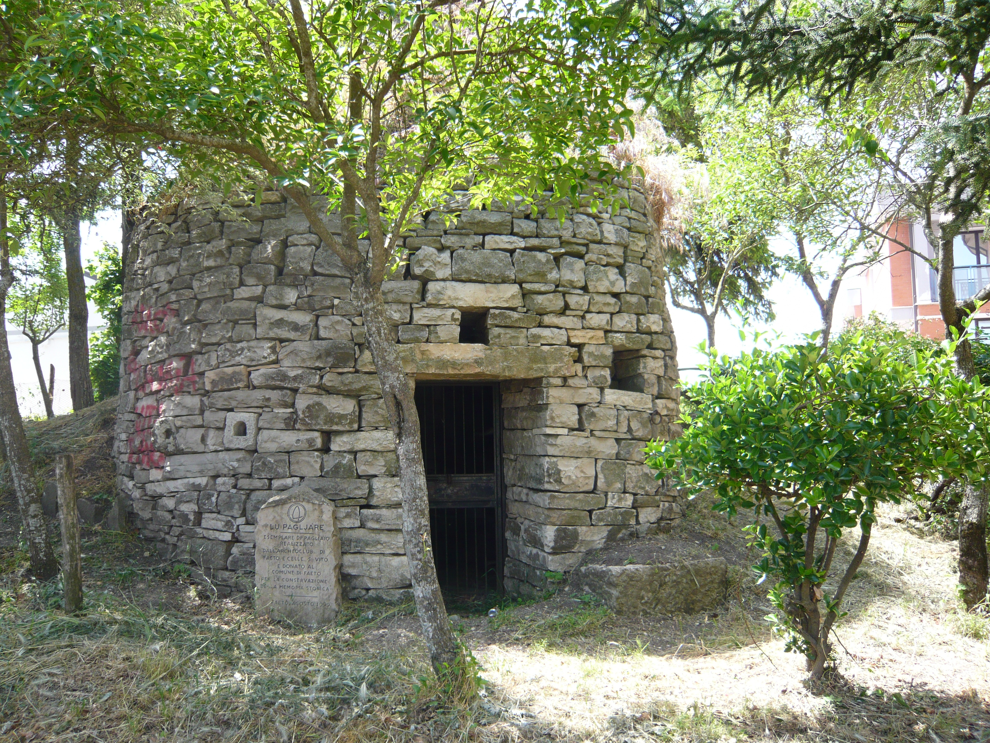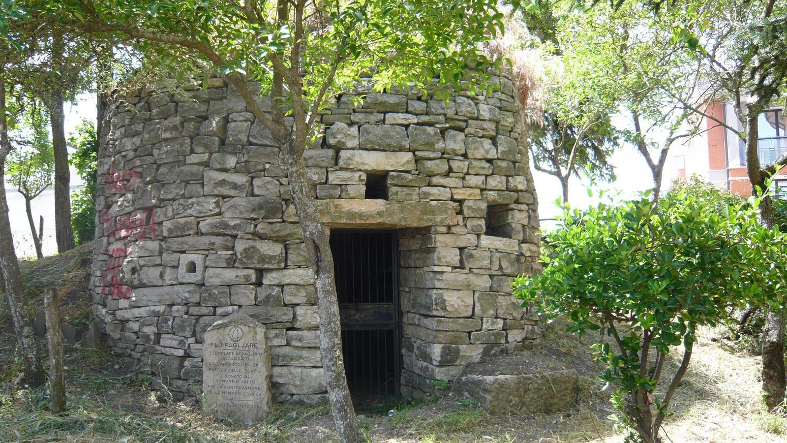 Il desiderio e la volontà di tramandare la memoria storica e culturale contadina si è concretizzata nella ricostruzione fedele del “Pagliaio”, antica costruzione in pietra e di forma conoidale, rappresentativa dell’architettura abitativa di una civiltà ormai estinta. Il pagliaio è costruito a secco in pietra, in particolare chianchètta, pietra piana e squadrata ed ha una pianta circolare; in elevazione assume la forma di un tronco di cono, chiuso da una grossa lastra di pietra, che fungeva da tetto. L'interno poteva essere intonacato ad argilla o a creta chiara. Questo tipo di costruzione sorgeva di norma a ridosso di un pendio e in parte era inglobato in esso, di modo che la forma dell'ambiente fosse percepibile solo dall'interno; mentre dall'esterno era visibile solo una sorta di muro convesso, corredato da porta d’ingresso. Ogni pagliaio aveva un’aia di propria pertinenza, come anche la custére o la pannìzze, ovvero i ricoveri per gli animali.