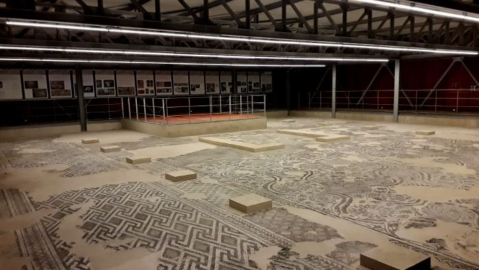 La sovrapposizione dei manufatti consente di individuare un primo nucleo insediativo, risalente al periodo compreso tra il I secolo a.C. e il I secolo d.C.e costituito da una villa rurale. Al periodo che va dal I al VI secolo d.C. risale invece una grande villa con caratteristiche sia residenziali che produttive, dotata di ambienti decorati da mosaici ed impianti di produzione del vino con torchio, vasche di fermentazione e contenitori infossati per la conservazione. Della prima metà del V secolo d.C. è poi una basilica paleocristiana a tre navate, pianta absidata e nartece collegato ad un battistero circolare esterno; a tale edificio appartengono i mosaici conservati all’interno della struttura realizzata negli orti dell'Ex Convento del SS Salvatore.