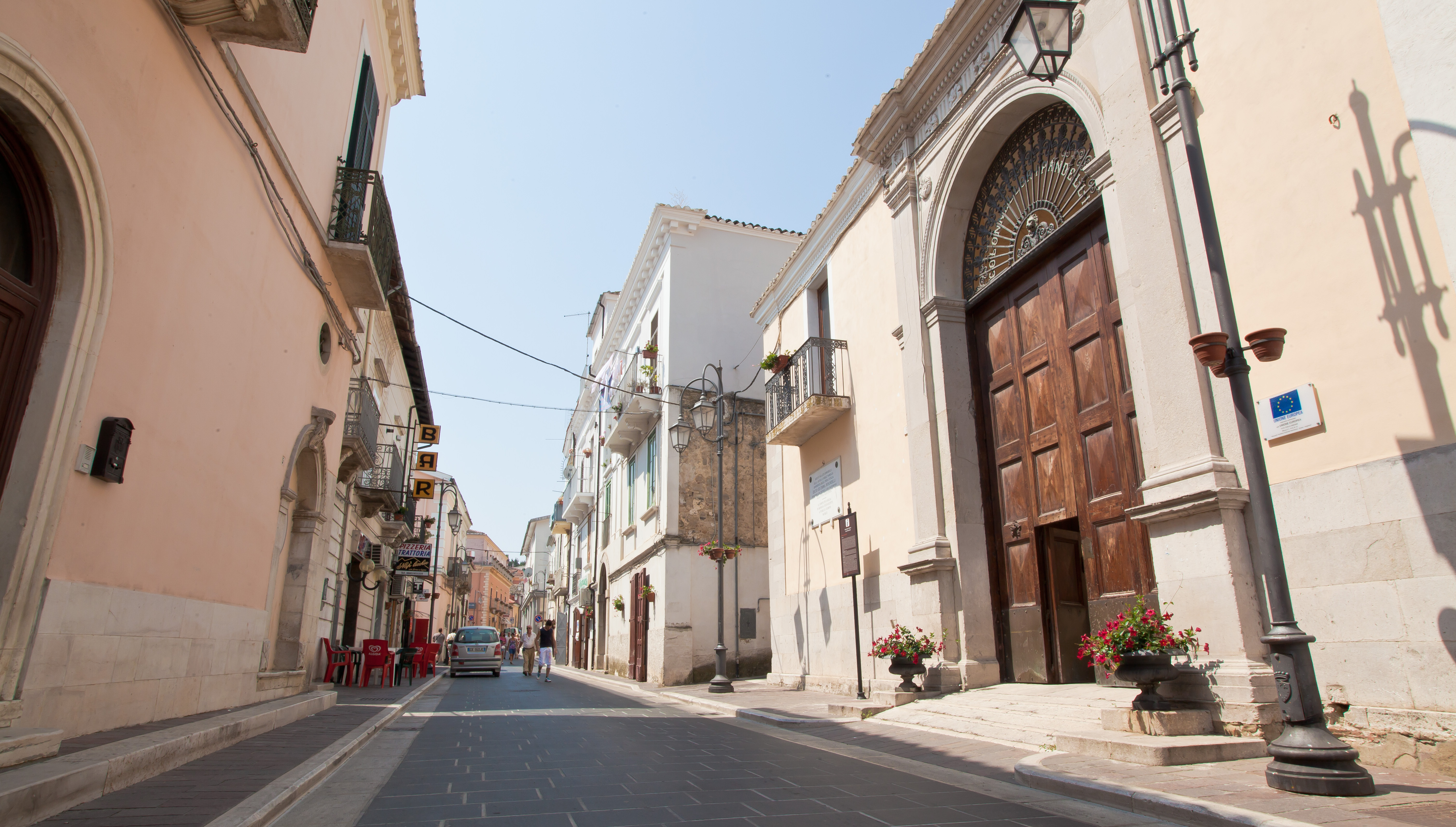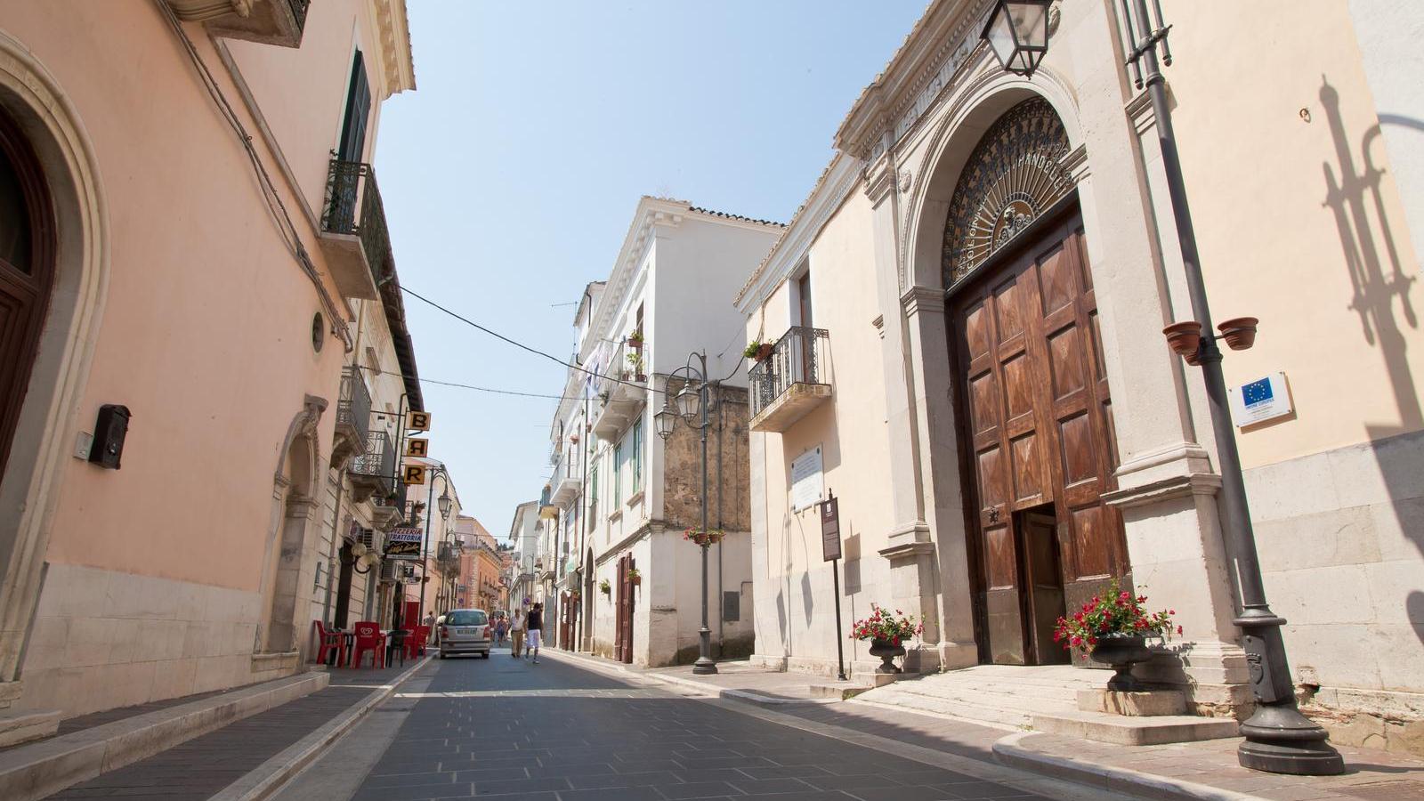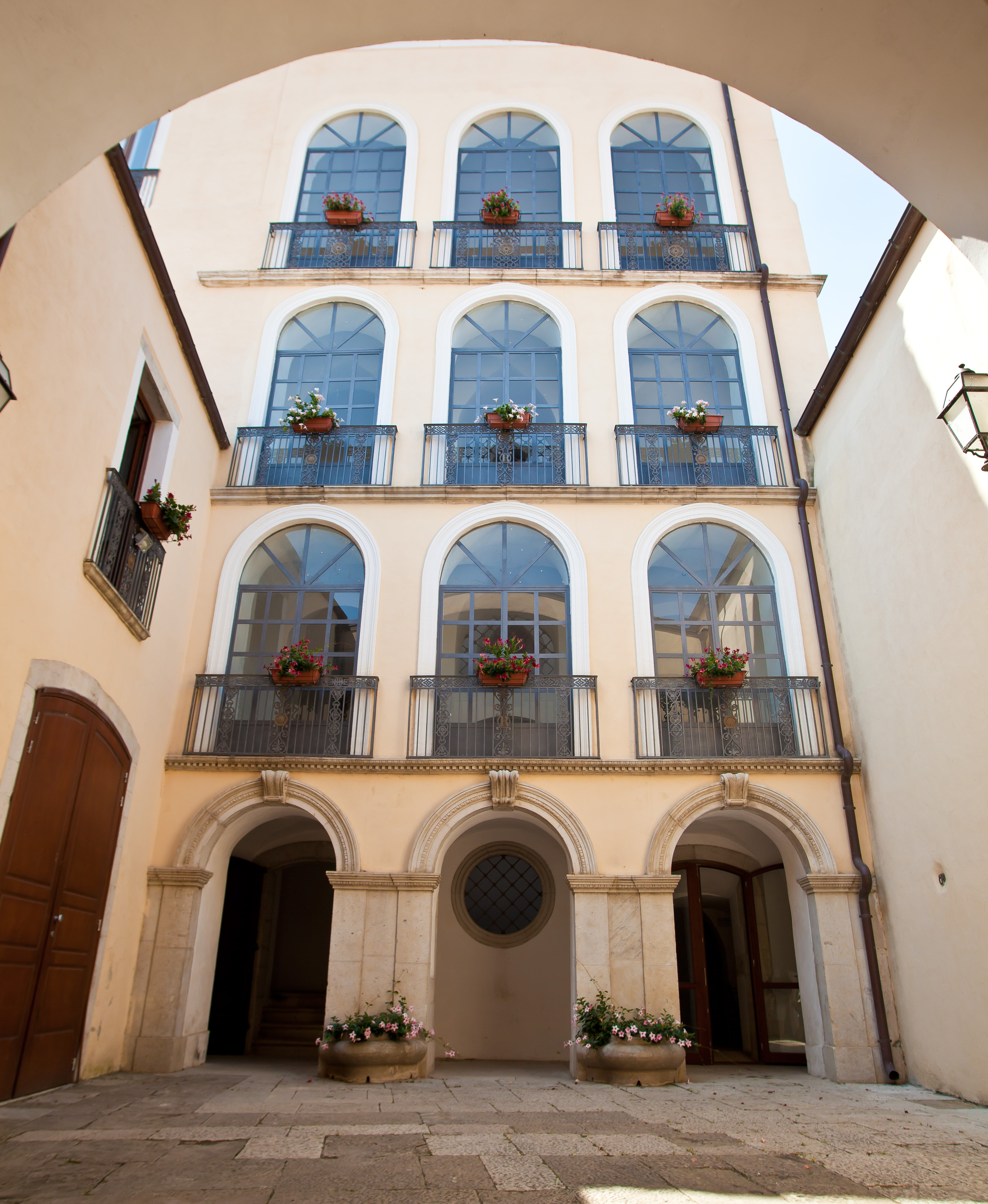 All'edificio si accede mediante un imponente portale lapideo che da a una ampia corte. A piano terra sono ancora intuibili i locali di servizio della dimora gentilizia, mentre sul fondo della corte si eleva la residenza signorile. Qui sorge un secondo prospetto interno, caratterizzato da ampie aperture con finestroni a tutto sesto, distribuiti su tre piani. Al piano terra tre armoniosi portali in pietra danno accesso, sul lato sinistro, ad una bella scalinata in pietra che conduce ai piani superiori.