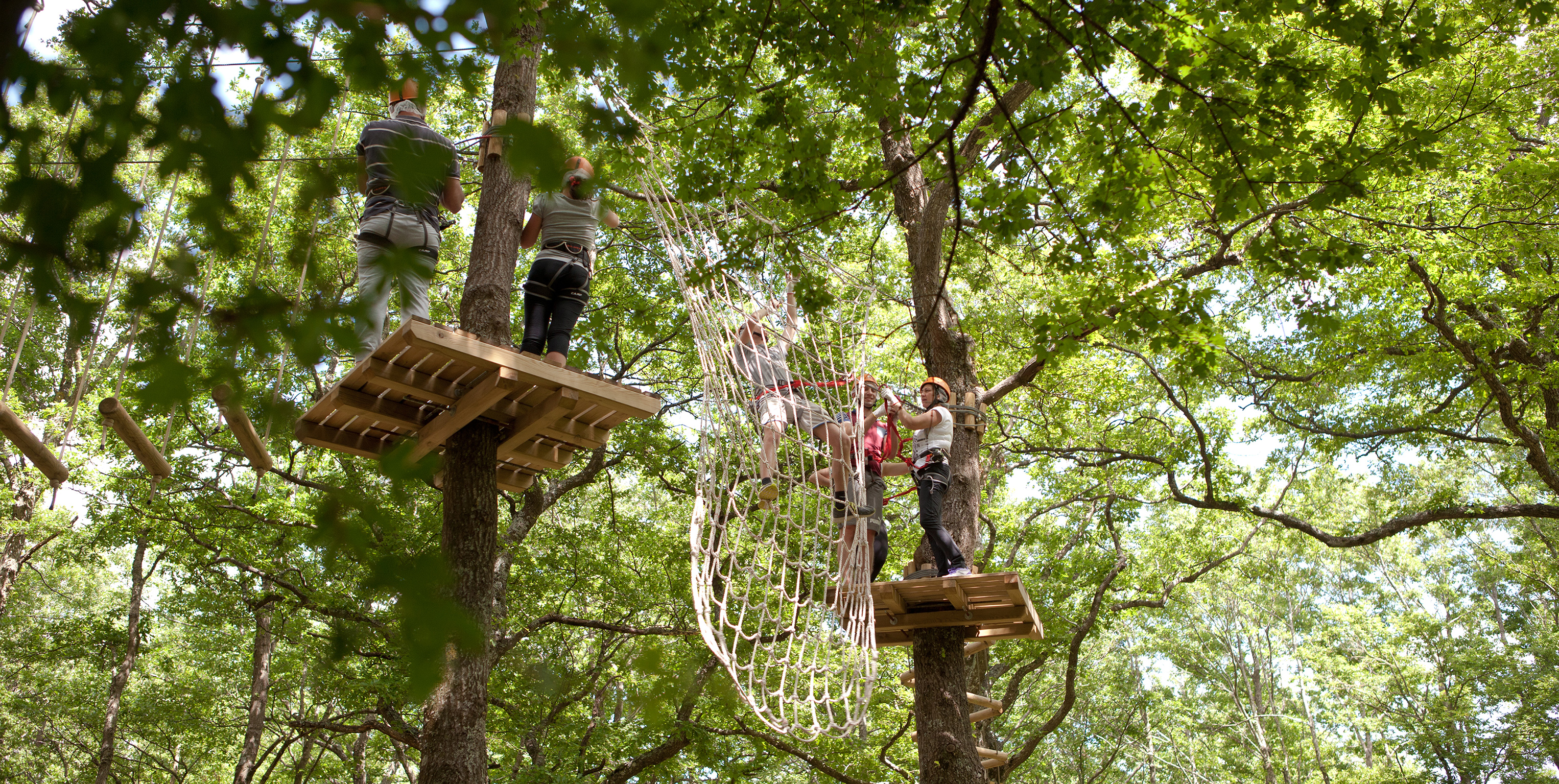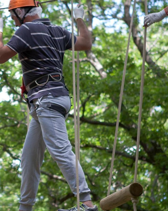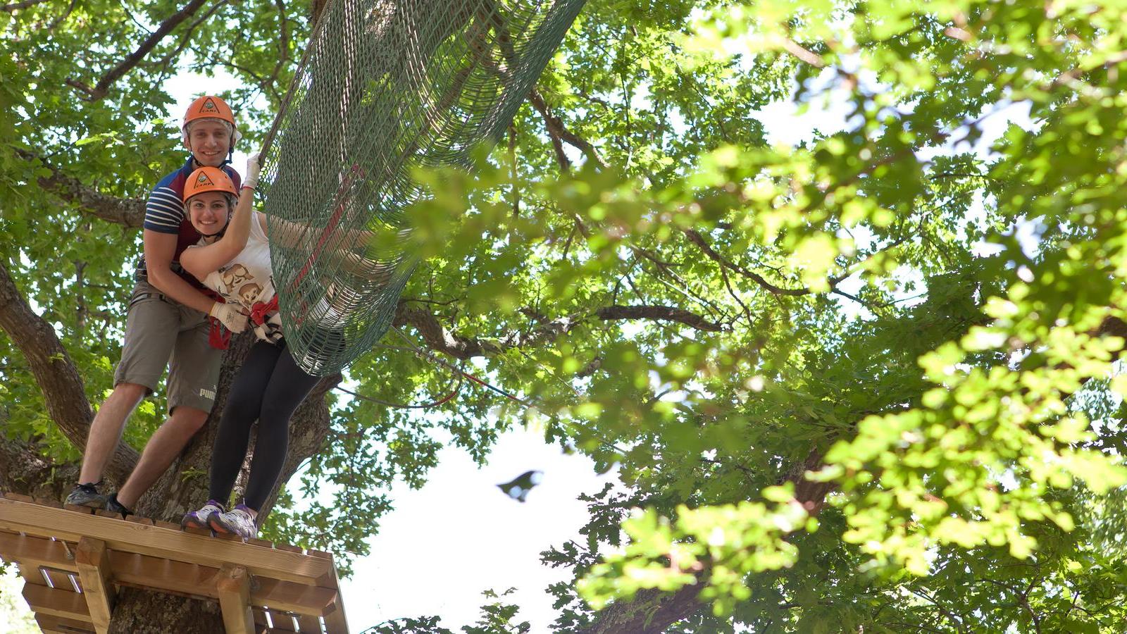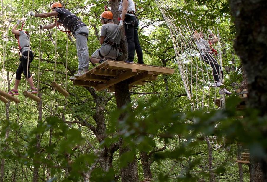 Tra i percorsi acrobatici dedicati ai più piccoli (dai 105 ai 130 cm di altezza) una serie di passaggi tra gli alberi posti ad un'altezza di 50 cm, privi di passaggi aerei, ma anche percorsi con passaggi dai e ai 4 metri di altezza. Per gli adulti (sopra i 140 cm di altezza) i percorsi acrobatici sospesi tra gli alberi sono ad altezze variabili tra i 4 e i 12 metri da terra, con la presenza di ponti tibetani, teleferiche a braccia e simulazioni di arrampicata.