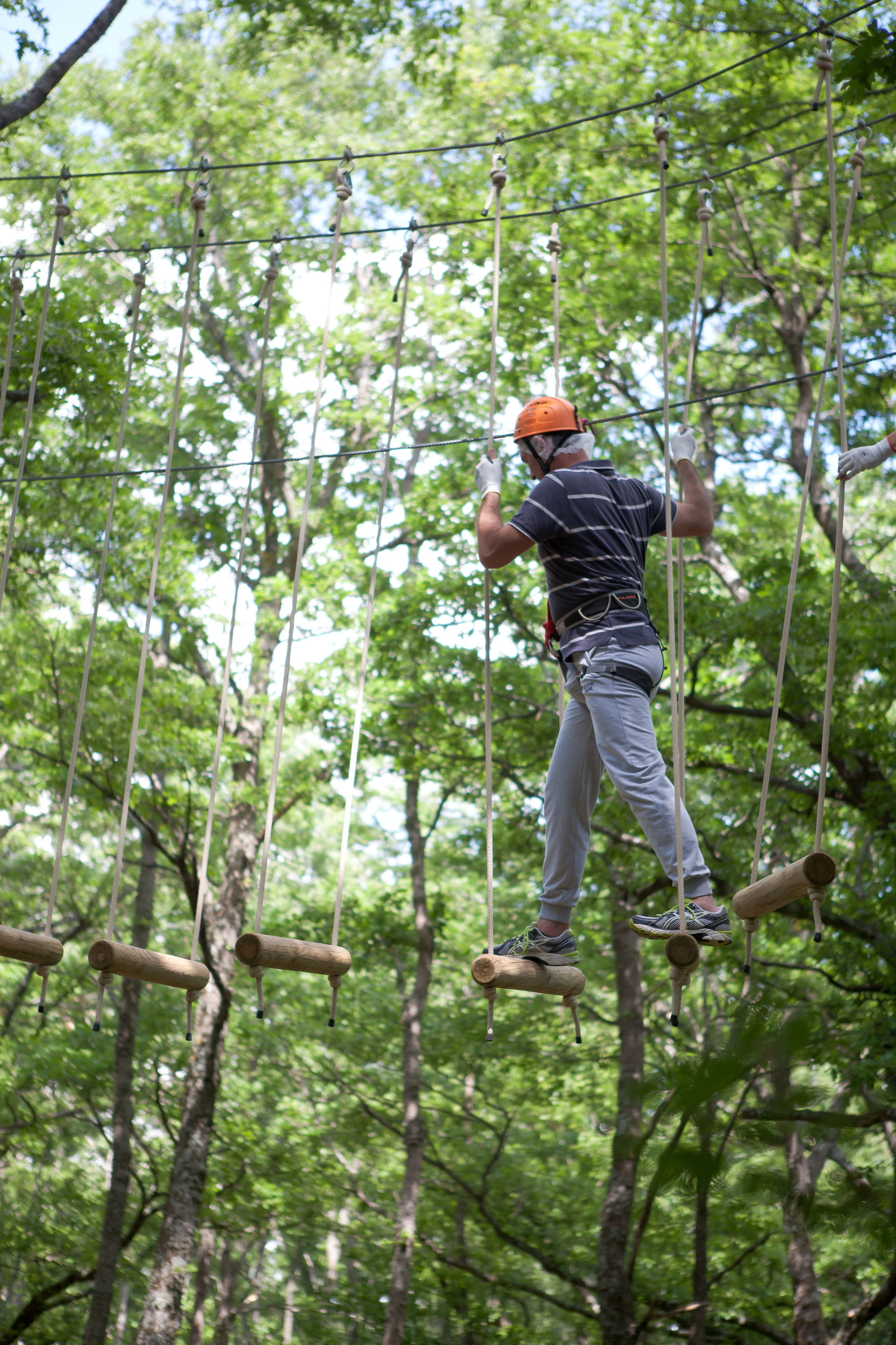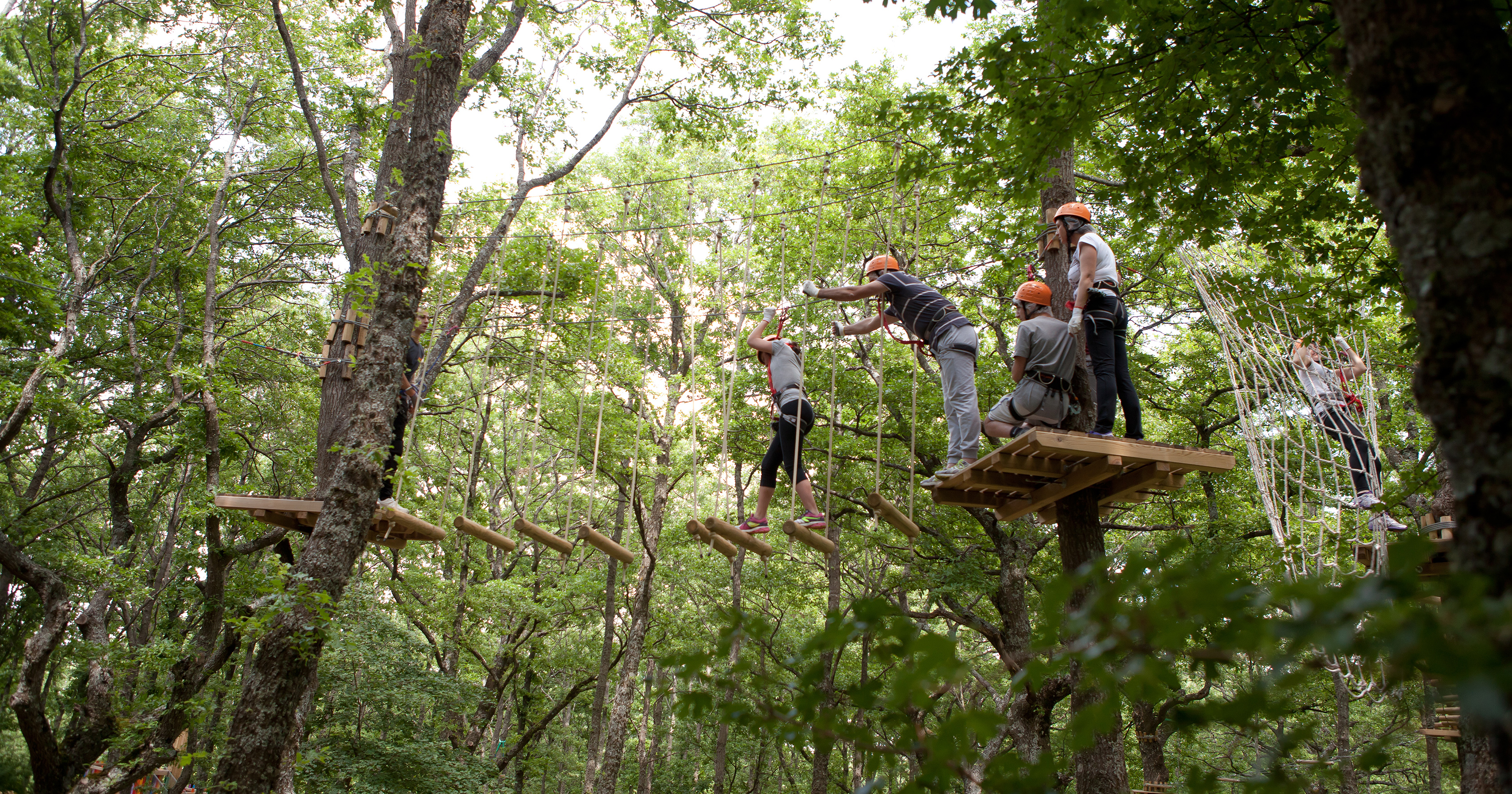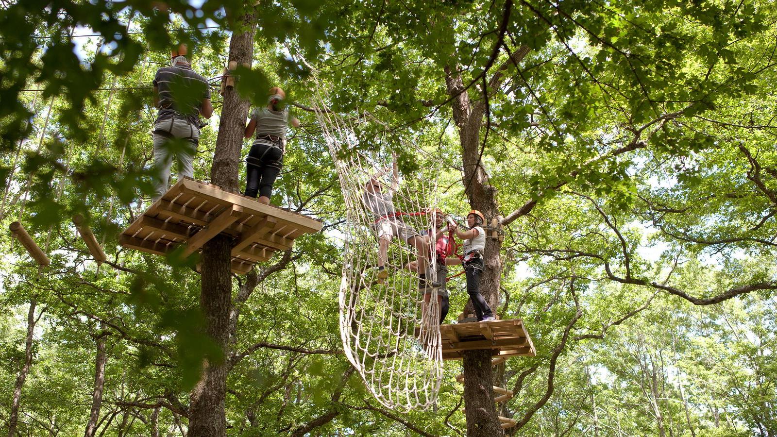 Tra i percorsi acrobatici dedicati ai più piccoli (dai 105 ai 130 cm di altezza) una serie di passaggi tra gli alberi posti ad un'altezza di 50 cm, privi di passaggi aerei, ma anche percorsi con passaggi dai e ai 4 metri di altezza. Per gli adulti (sopra i 140 cm di altezza) i percorsi acrobatici sospesi tra gli alberi sono ad altezze variabili tra i 4 e i 12 metri da terra, con la presenza di ponti tibetani, teleferiche a braccia e simulazioni di arrampicata.
