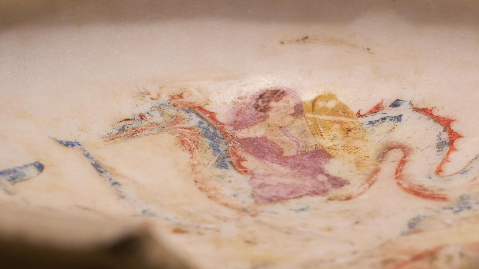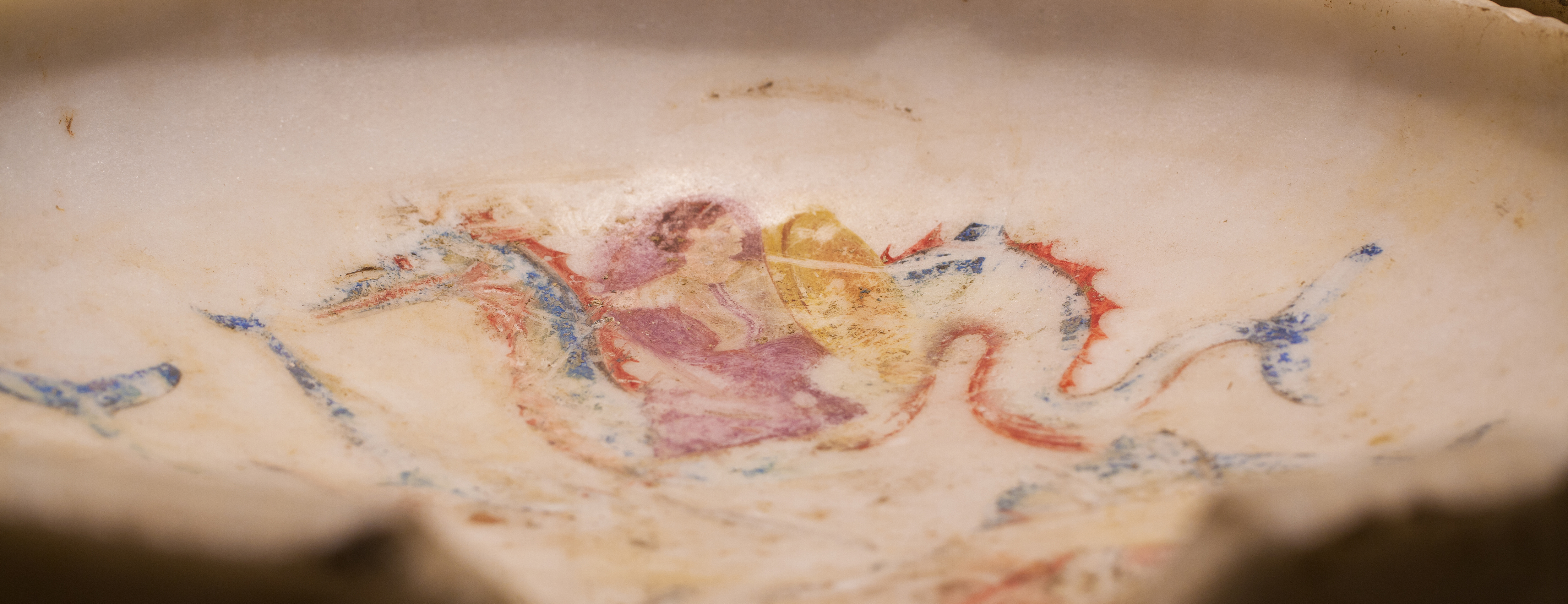 Il bacino in un marmo prezioso, quasi trasparente, è sorretto da 3 supporti a zampa di animale. Nel suo incavo, con una prevalenza di rosso, verde e giallo è possibile intravedere ancora la scena, raccontata da Omero nel VII canto dell'Iliade, del trasporto delle armi che Efesto forgiò per Achille su richiesta della madre Teti: si vedono le Nereidi a Cavallo di fantastici animali marini. La qualità del materiale e della pittura lasciano lo spettatore senza fiato.
