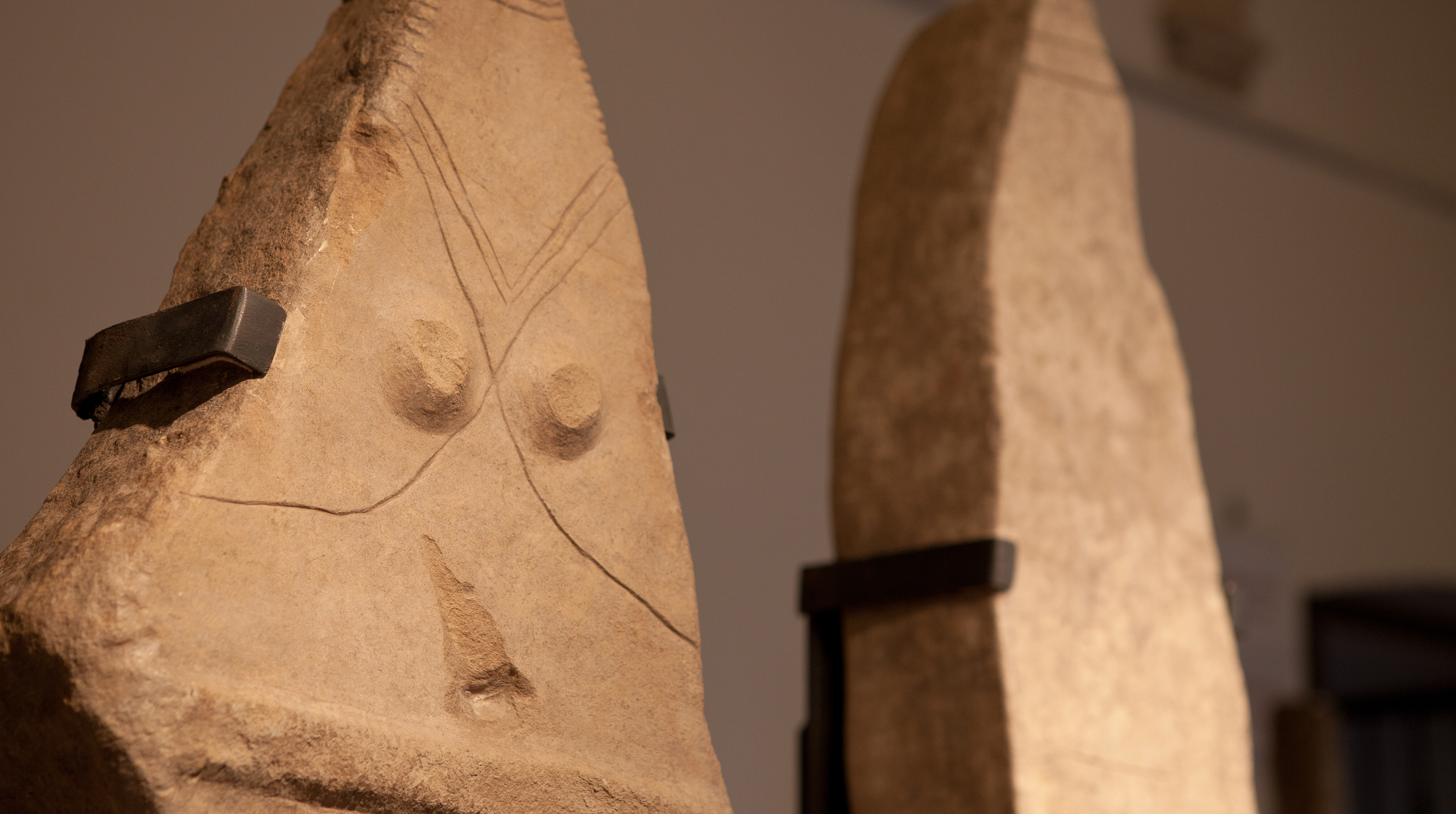 Le stele possono essere suddivise in "femminili", caratterizzati da una restituzione rappresentativa della femminilità: in alto un scollatura contiene dei seni, sovrastati da una collana, in basso un ombelico e una cintura; e in "maschili", caratterizzati invece da una sorprendete restituzione simbolica della virilità: un pugnale, dalla cui punta sgorga un fiotto di sangue, inserito nel fodero e legato ad un a cintura a bandoliera.